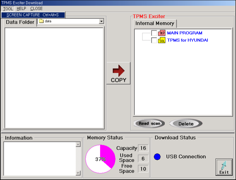 the SCREEN CAPTURE VIEW MENU of TPMS EXCITER initial screen or TPMS