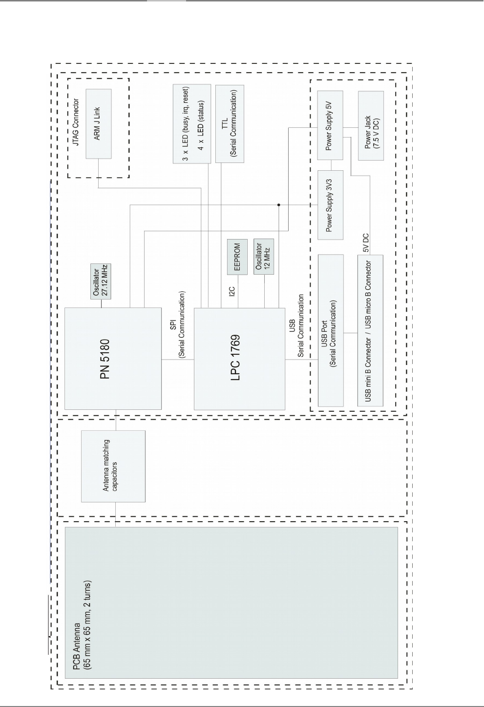 •the reader part: PN5180 reader IC, LPC 1769 microcontroller IC, two crystall oscillators and decopling