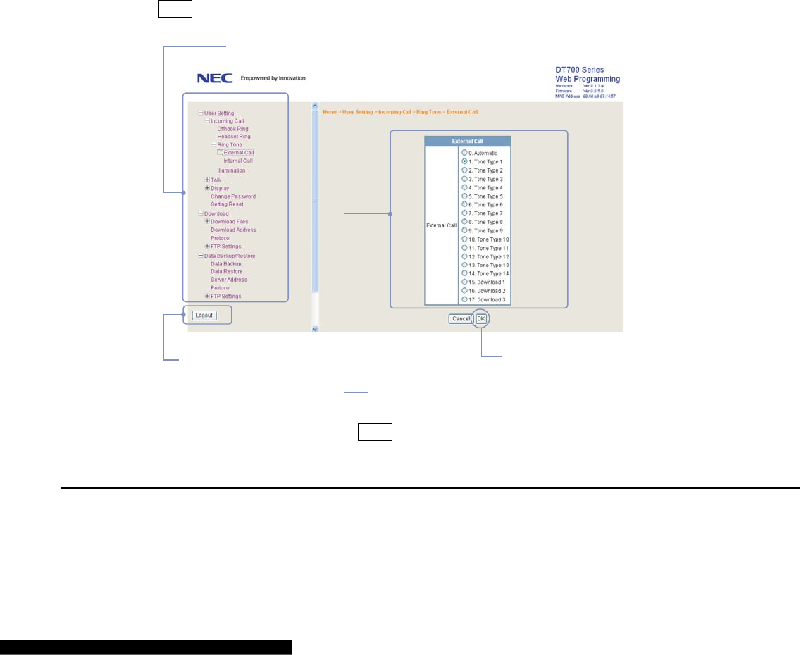 As an example of setting method on the Web Programming, the following explains how to change the ringer tone for