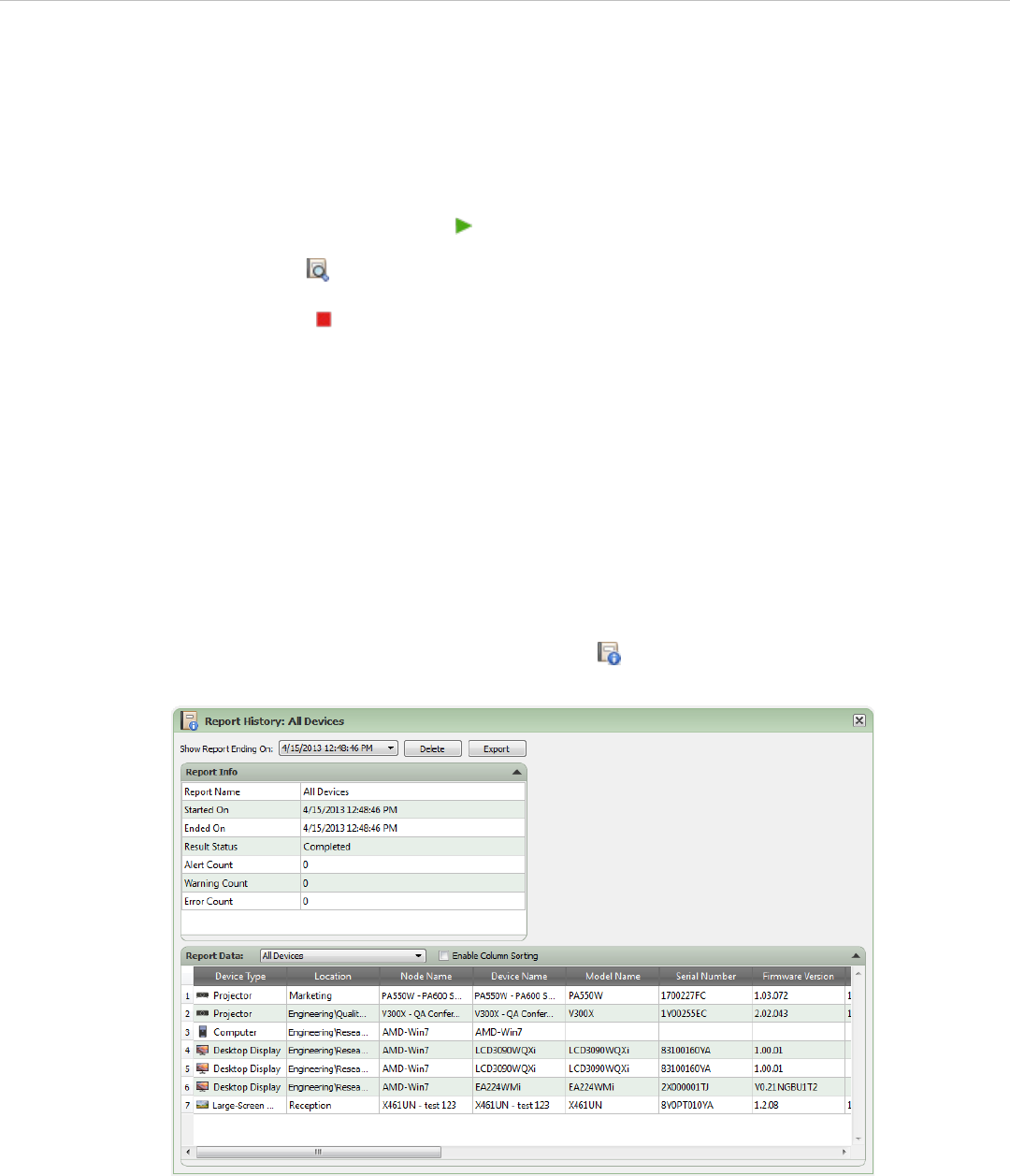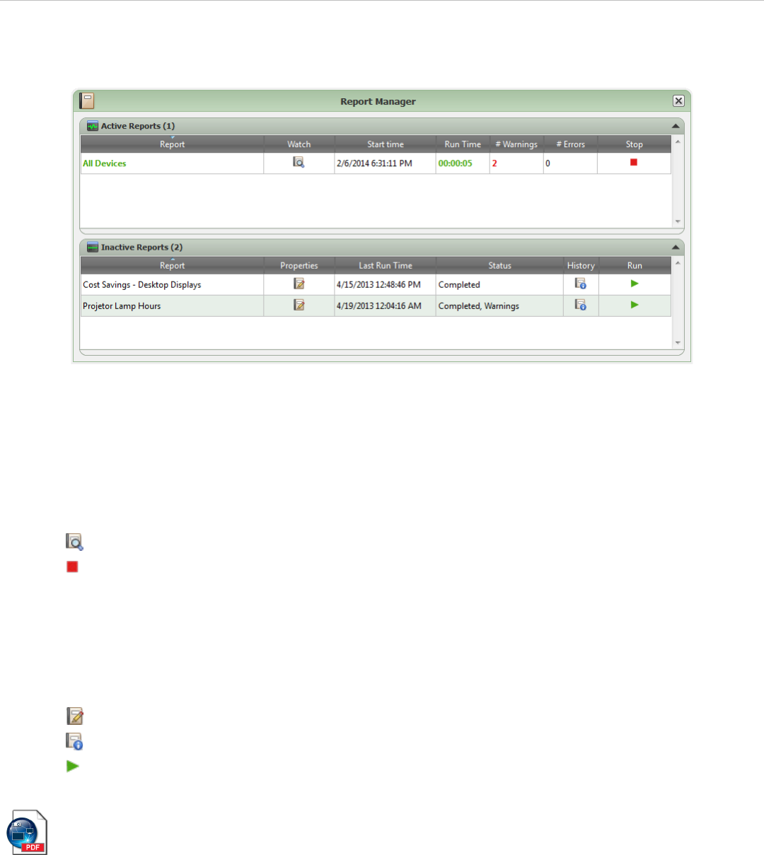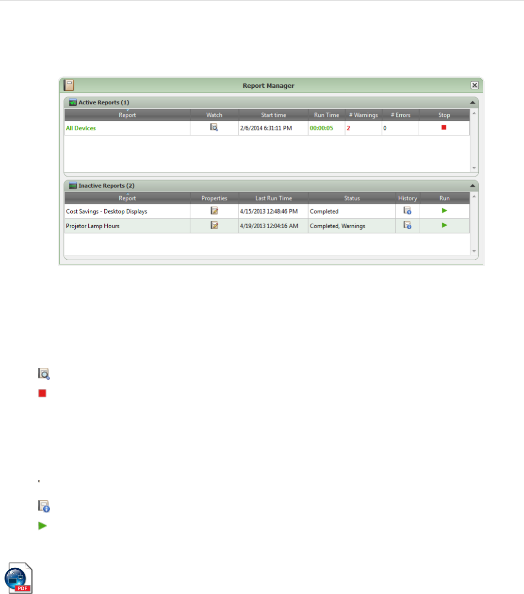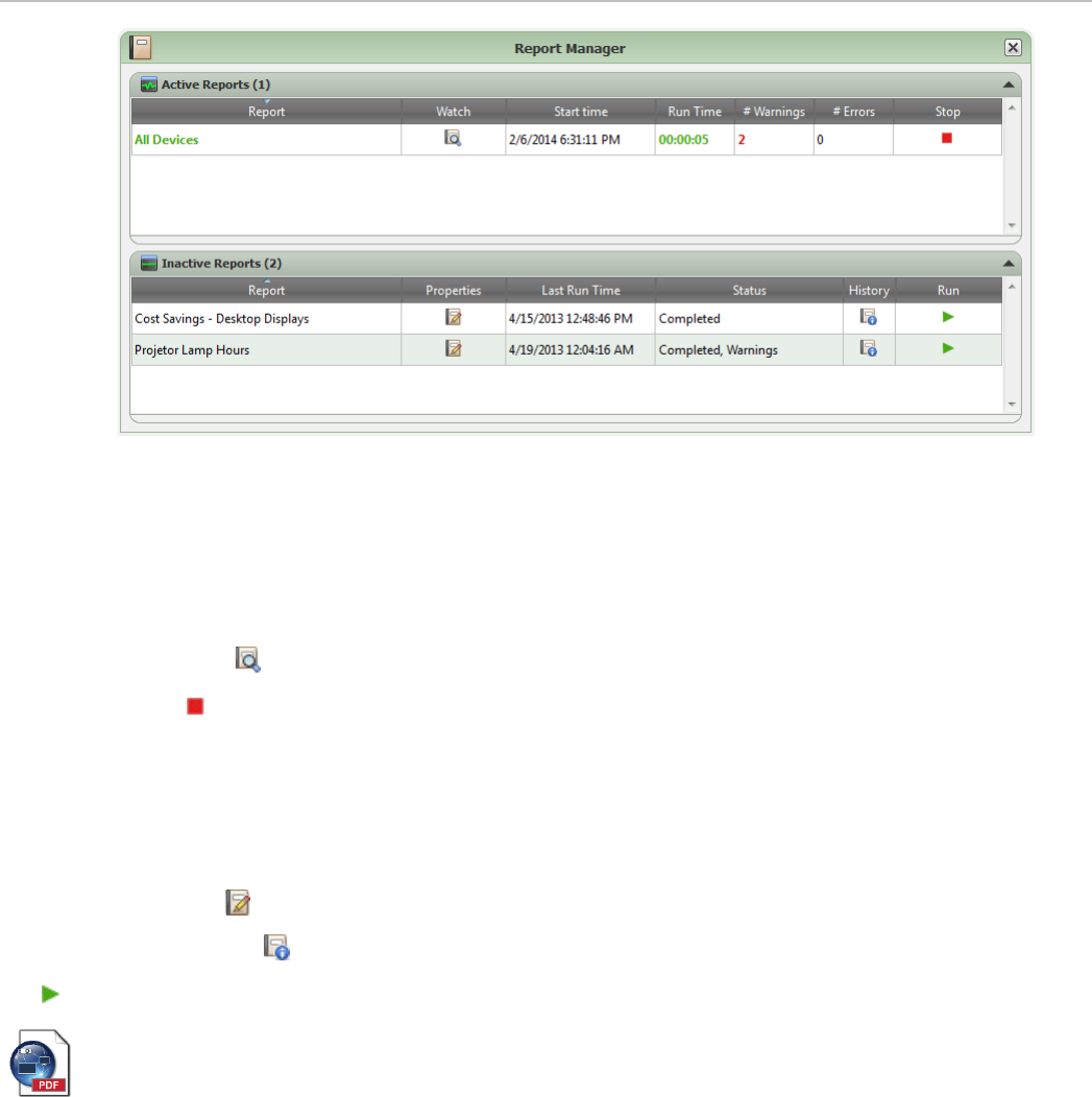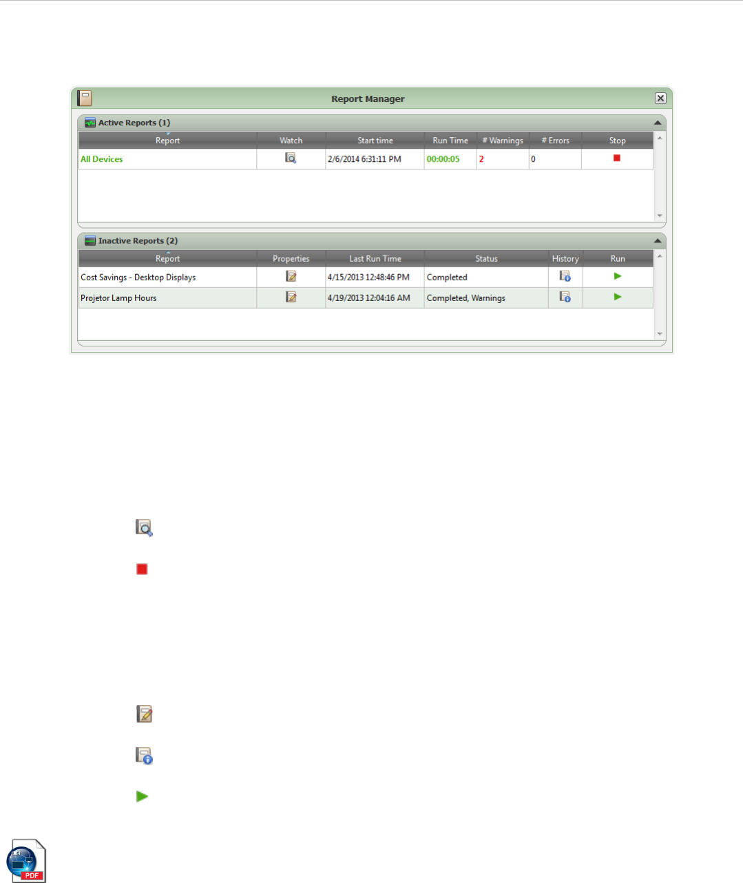 活动报告表显示正在运行的、数据库中定义的报告。 在启动时,报告将从非活动报告表中移动至活动报告表。 完成或终止后,