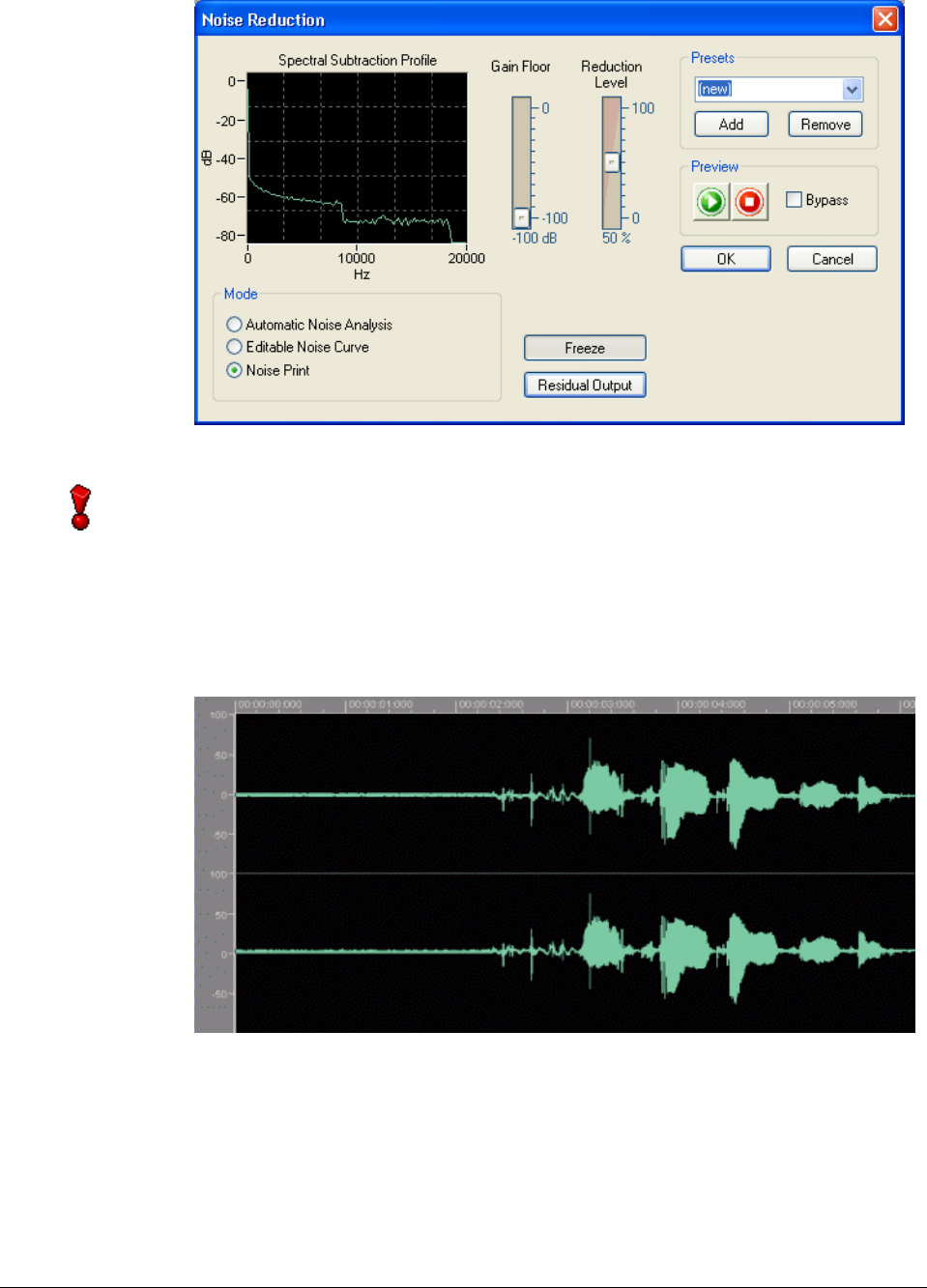 ‘Noise Print’ option is active during noise reduction in the noise analysis