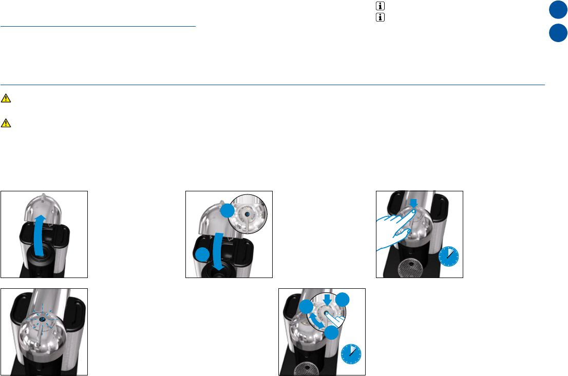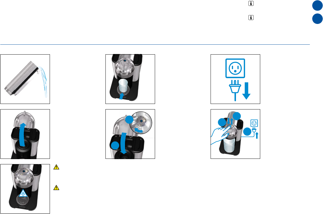➔ Pendant la procédure de détartrage, de vidange et de nettoyage: 1) Vérier si la capsule usagée a été expulsée. 2) Vérier si la poignée est en position «VERROUILLÉE». 3) Tenir le bouton