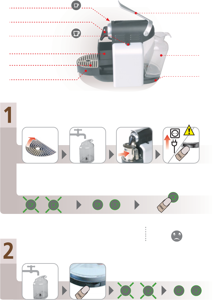 • Never use warm or hot water to ll the water container. Use cold water only!