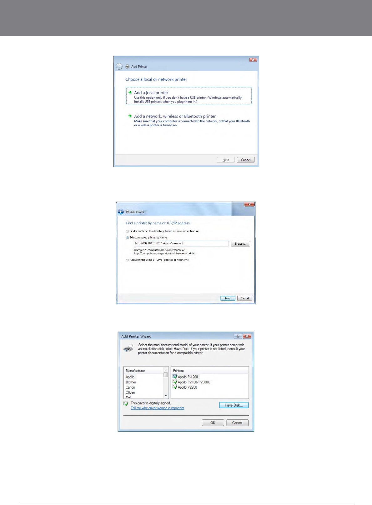 These steps explain the procedure for enabling the Printer Server for Windows Vista or Windows 7.