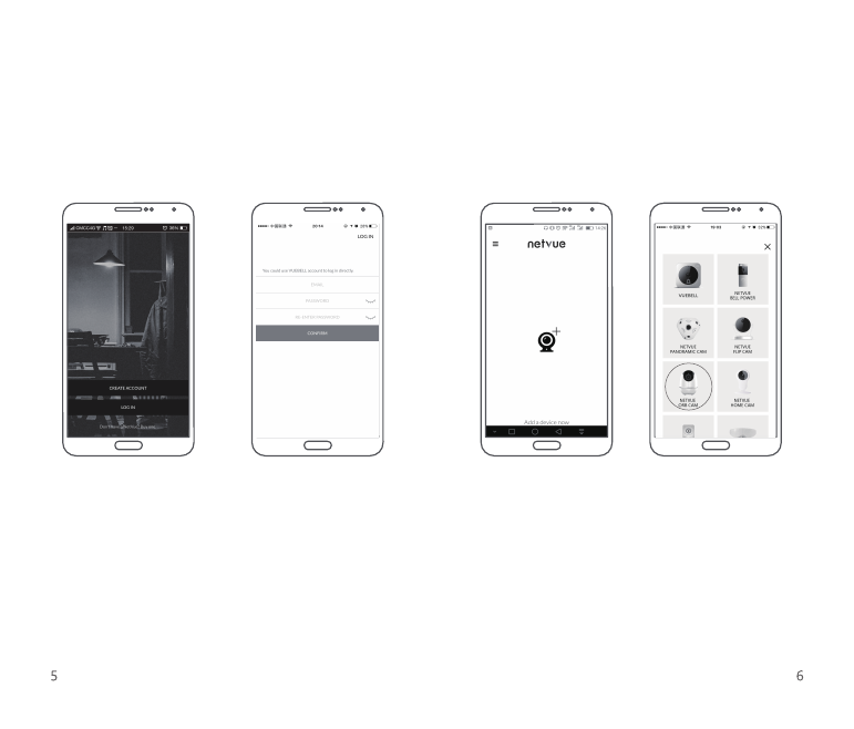 Open the app Register account Add device Choose Netvue Ord Cam