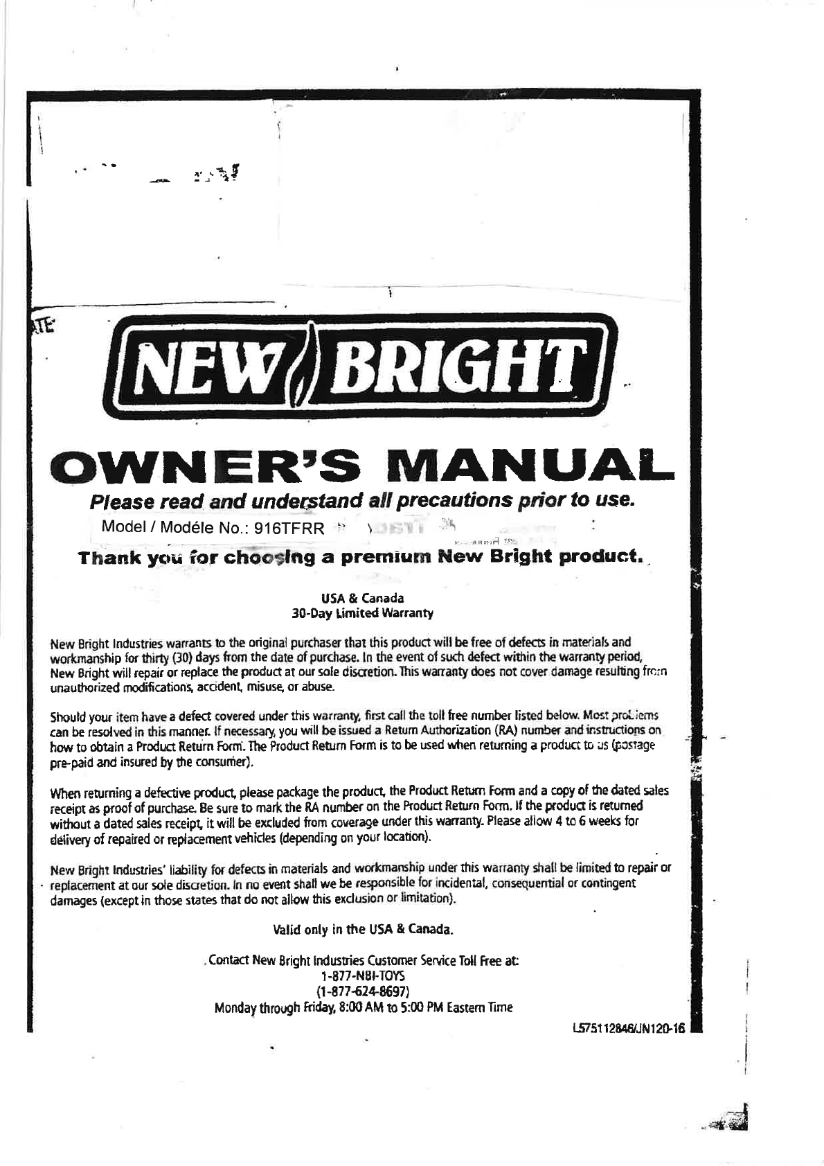 New Bright Co 916TFRR TOY Transmitter User Manual