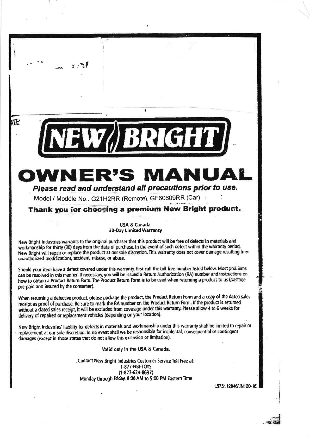 New Bright Co G21H2RR Toy Transmitter User Manual