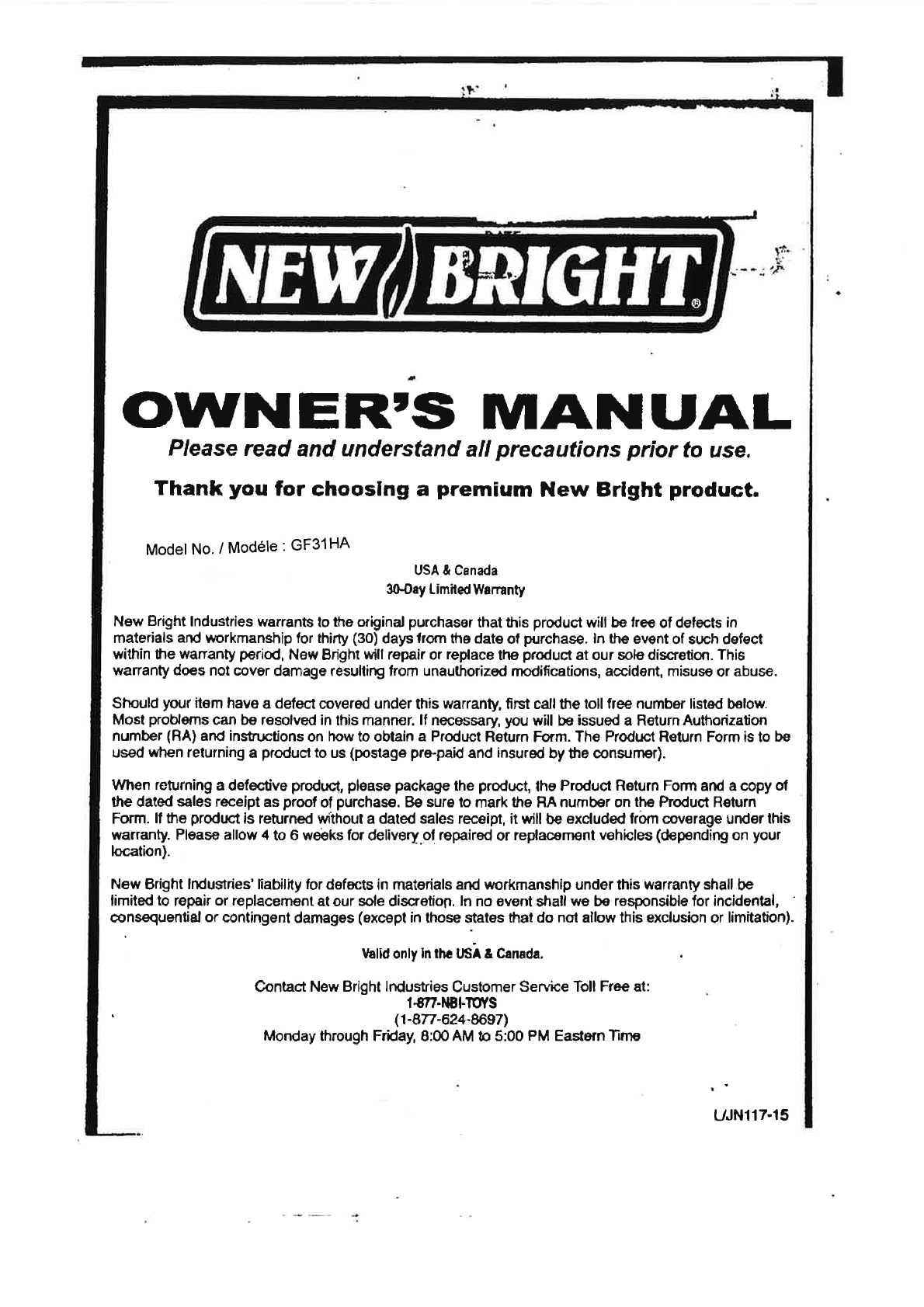New Bright Co GF31HA TOY Transmitter User Manual Manual