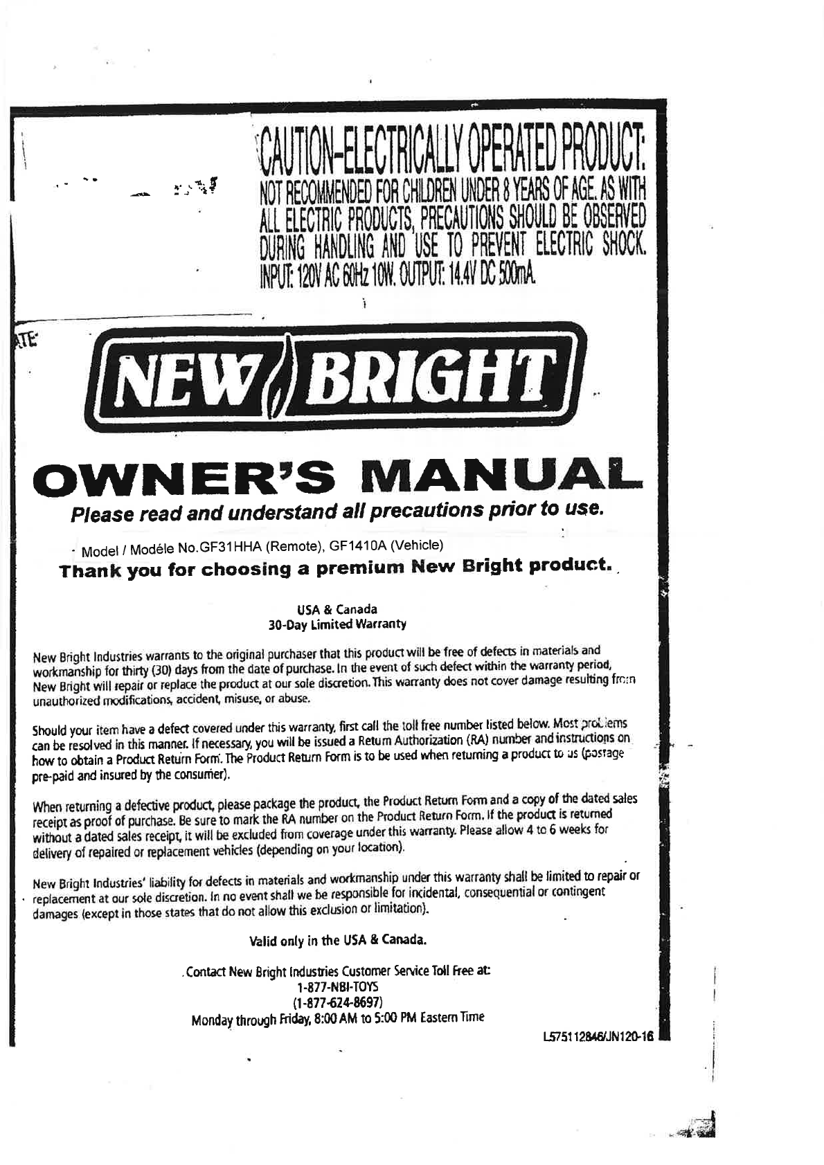 New Bright Co GF31HHA TOY Transmitter & Receiver User Manual