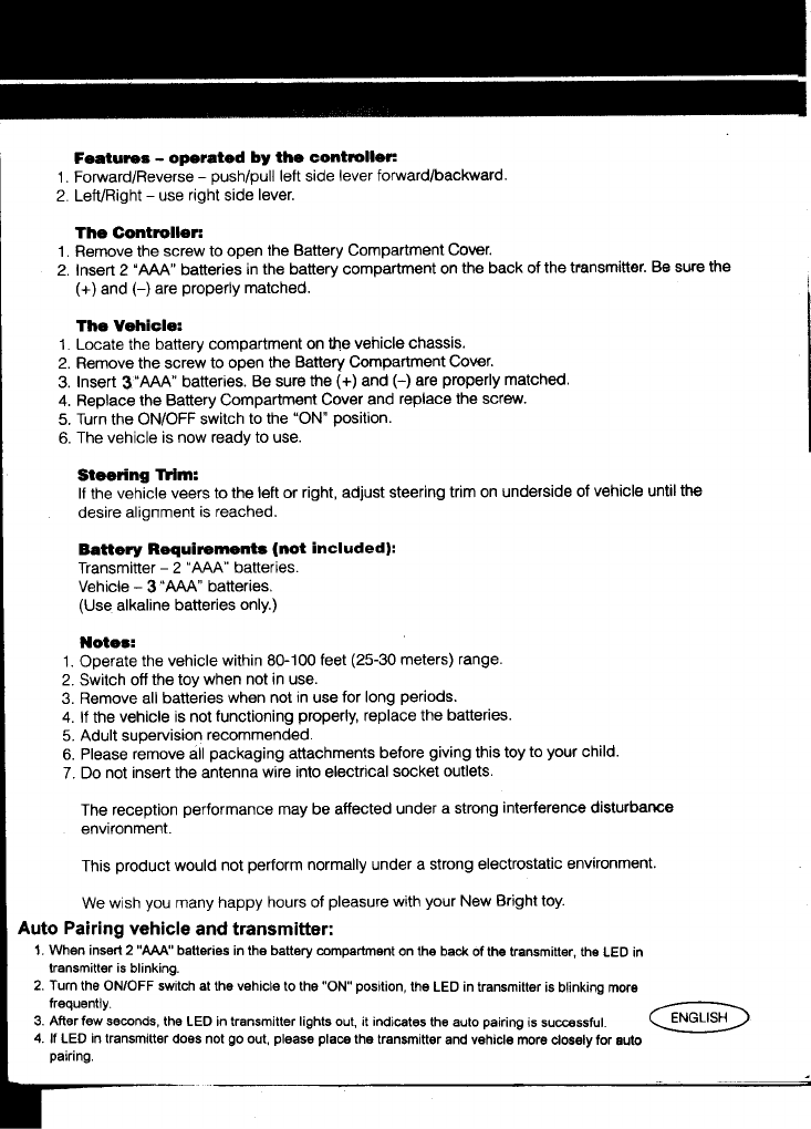 New Bright Co GF41H TOY Transmitter & Receiver User Manual