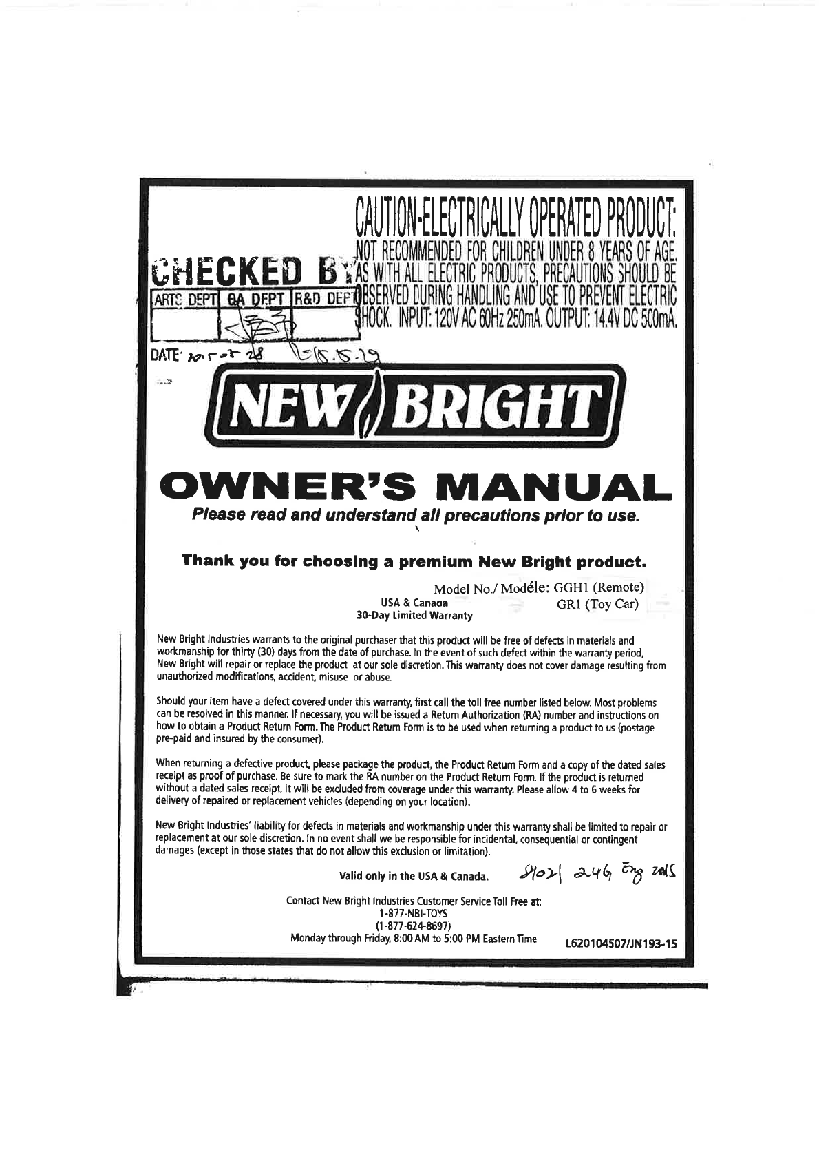 New Bright Co GGH1 Toy Transmitter and Receiver User Manual