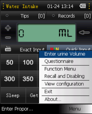 water intake, indexes, Max. urine volume, viewing urinary diary, and viewing