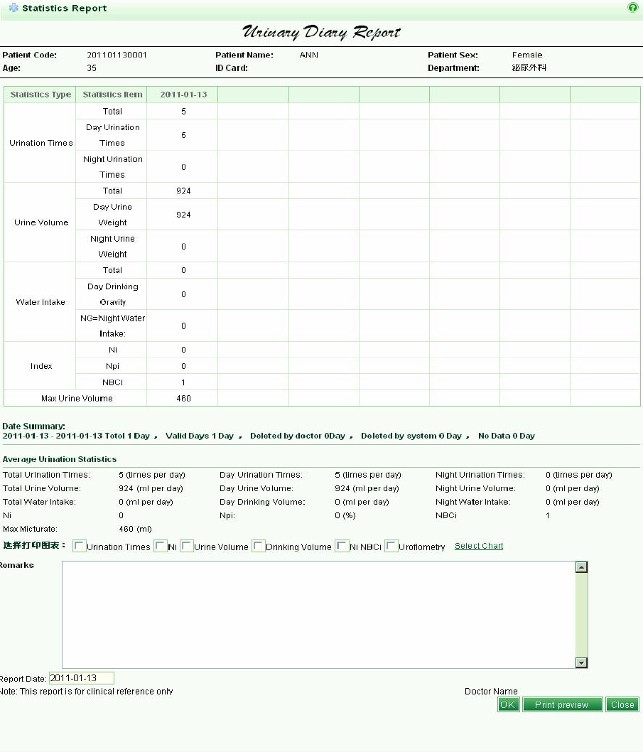 ¾ Optional print: Including urination times, NPI, urine volume, water intake, NI, NBCI, and