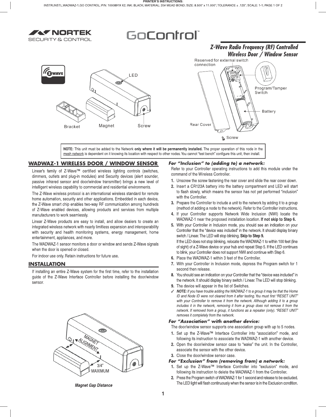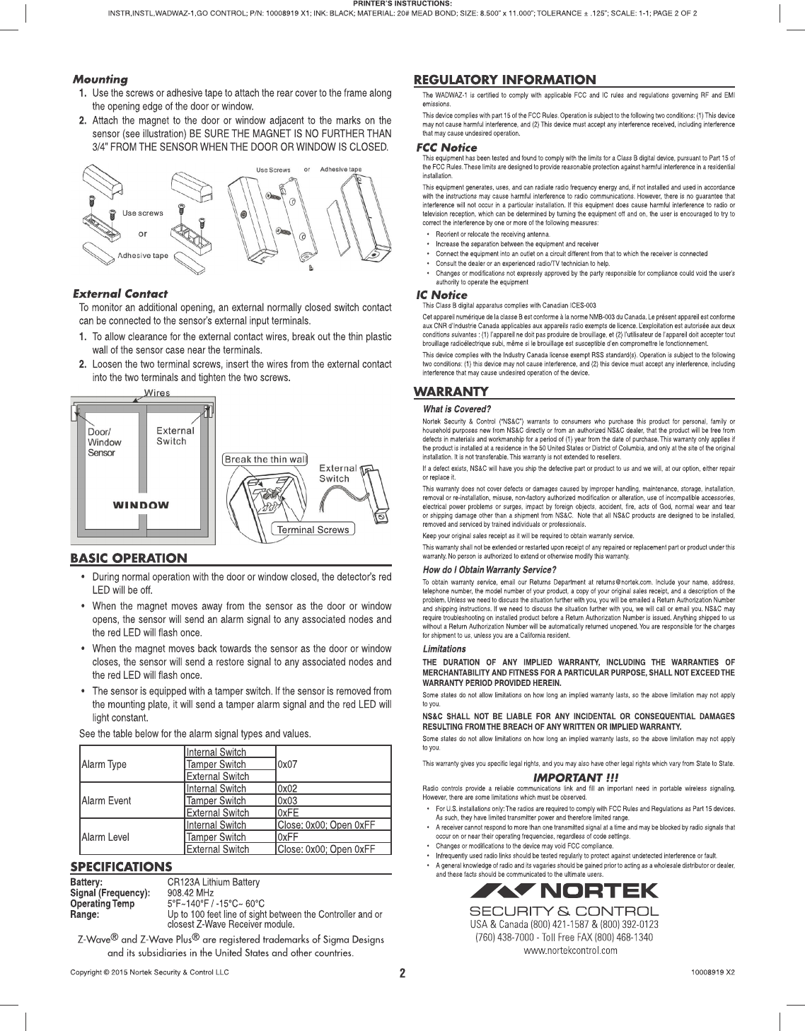 Nortek Security & Control LLC Wireless Door / Window Sensor Users Manual