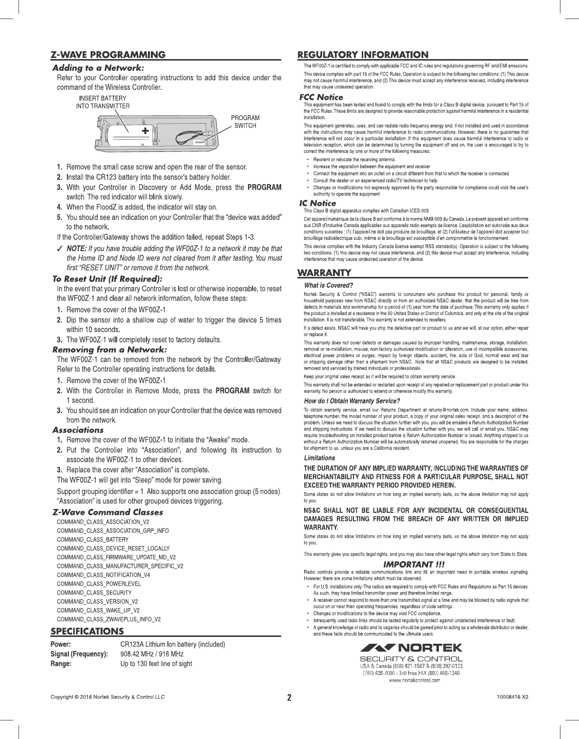 Nortek Security & Control LLC F/G 500 series Flood Sensor, NA, WH Users Manual