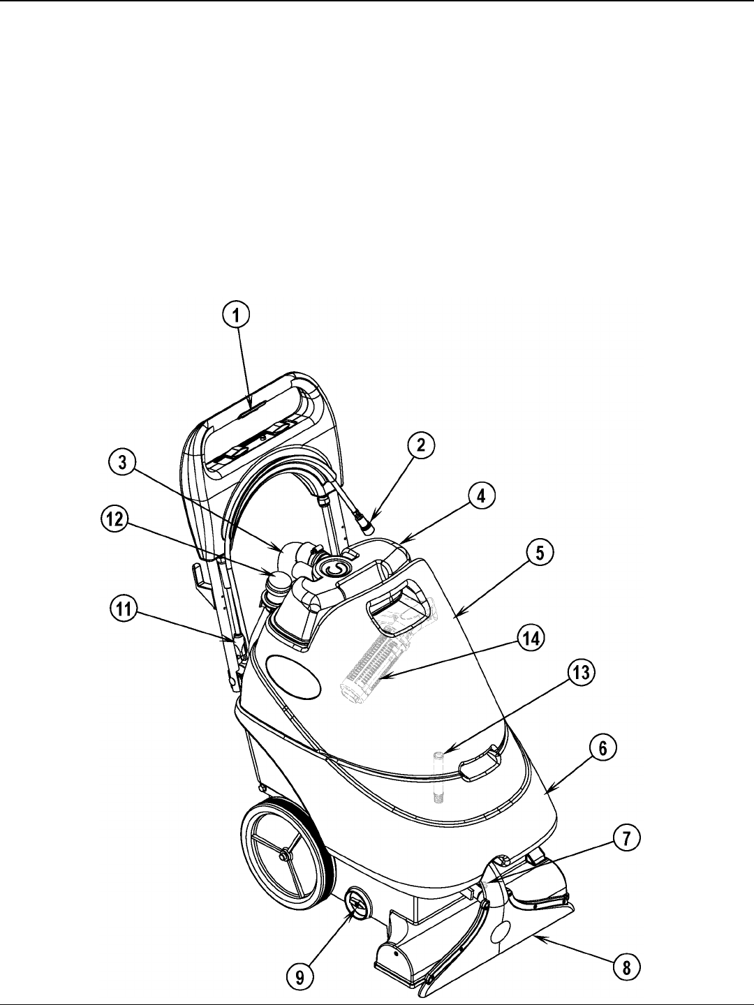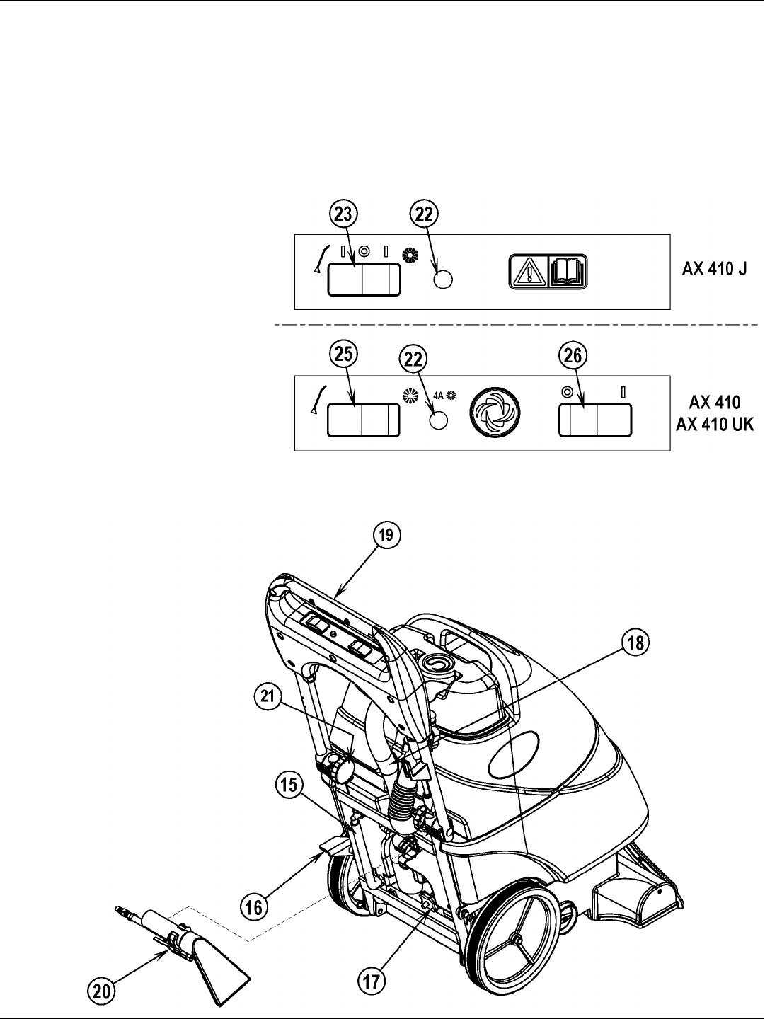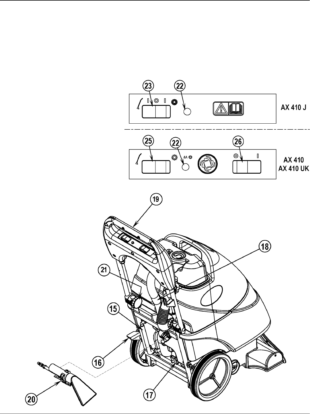 The Circuit Breaker (20) is located on the Control Panel; it protects the electrical circuit and brush motor from damage due to overload conditions. If