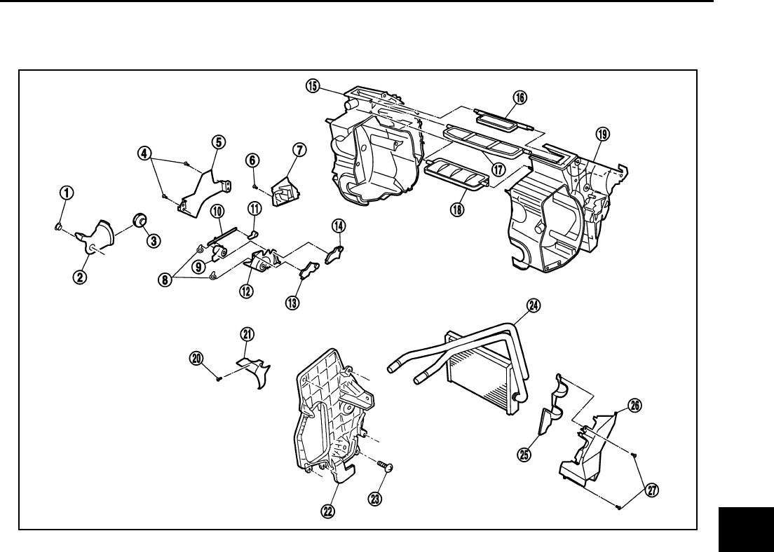 25. Heater core cover 26. Foot duct (left side) 27. Screw