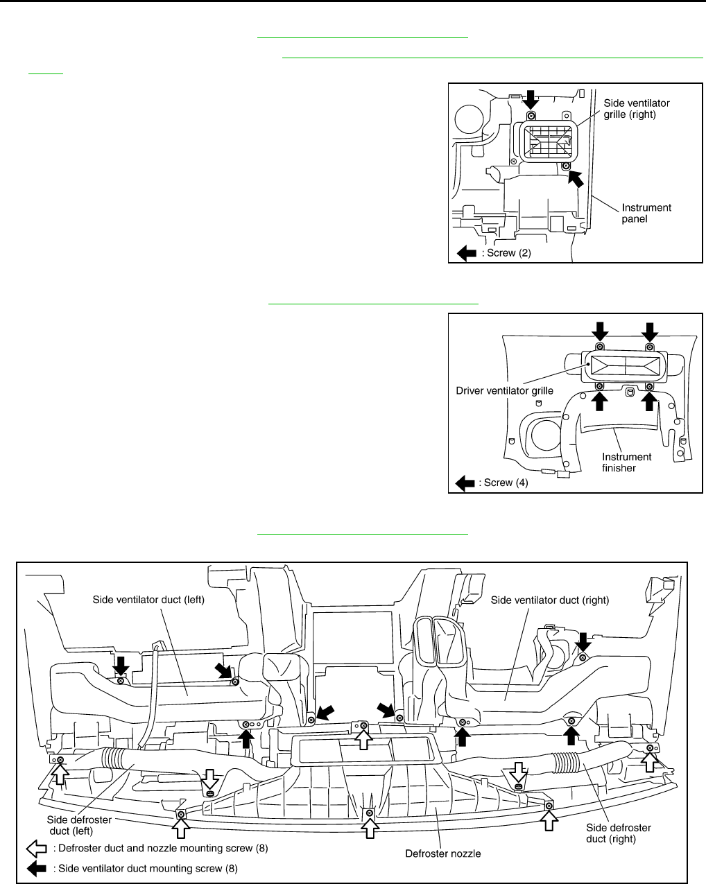 2. Remove side ventilator ducts. Refer to MTC-34, "Removal of Defroster Nozzle, Duct and Side Ventilator