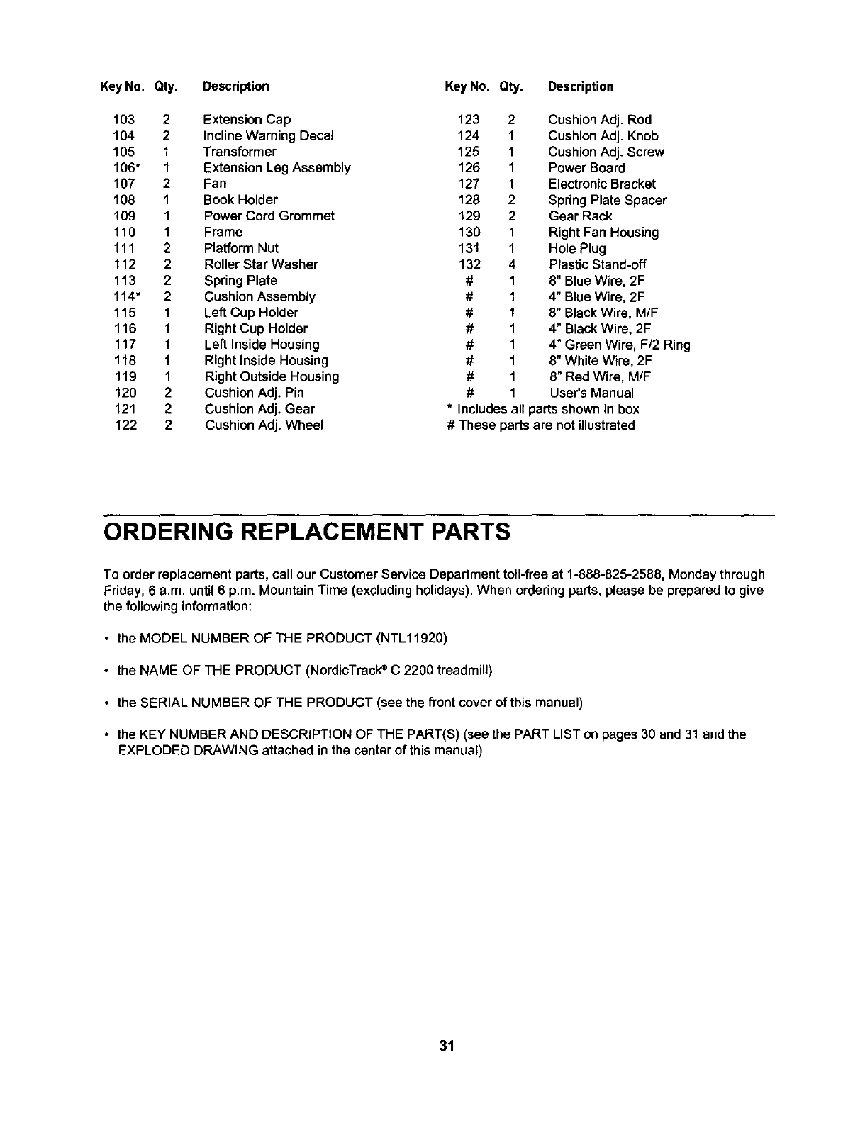 To order replacement parts, call our Customer Service Departmenttoil-free at 1-888-825-2588, Monday through