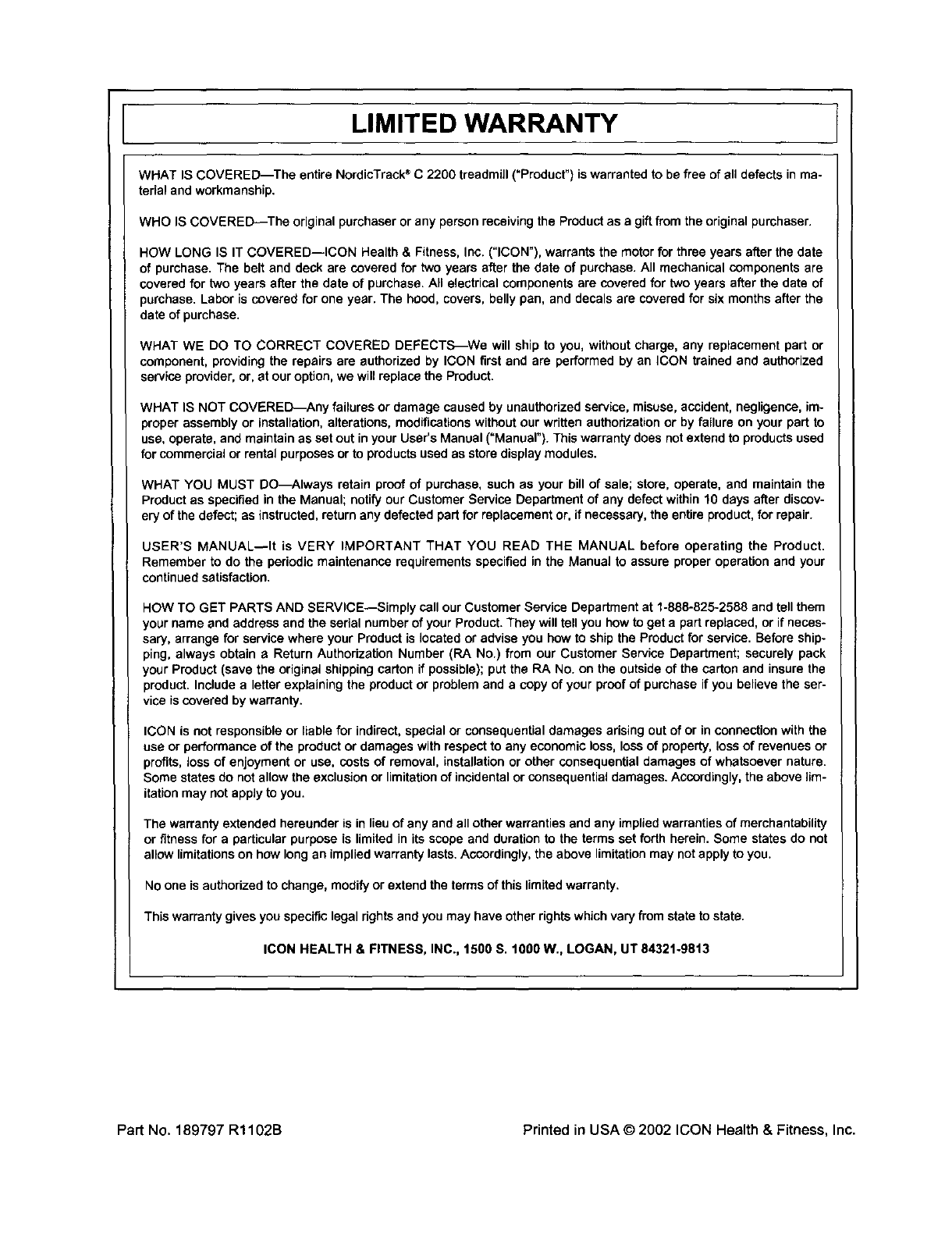 Part No. 189797 Rl102B Printed in USA © 2002 ICON Health & Fitness, Inc.