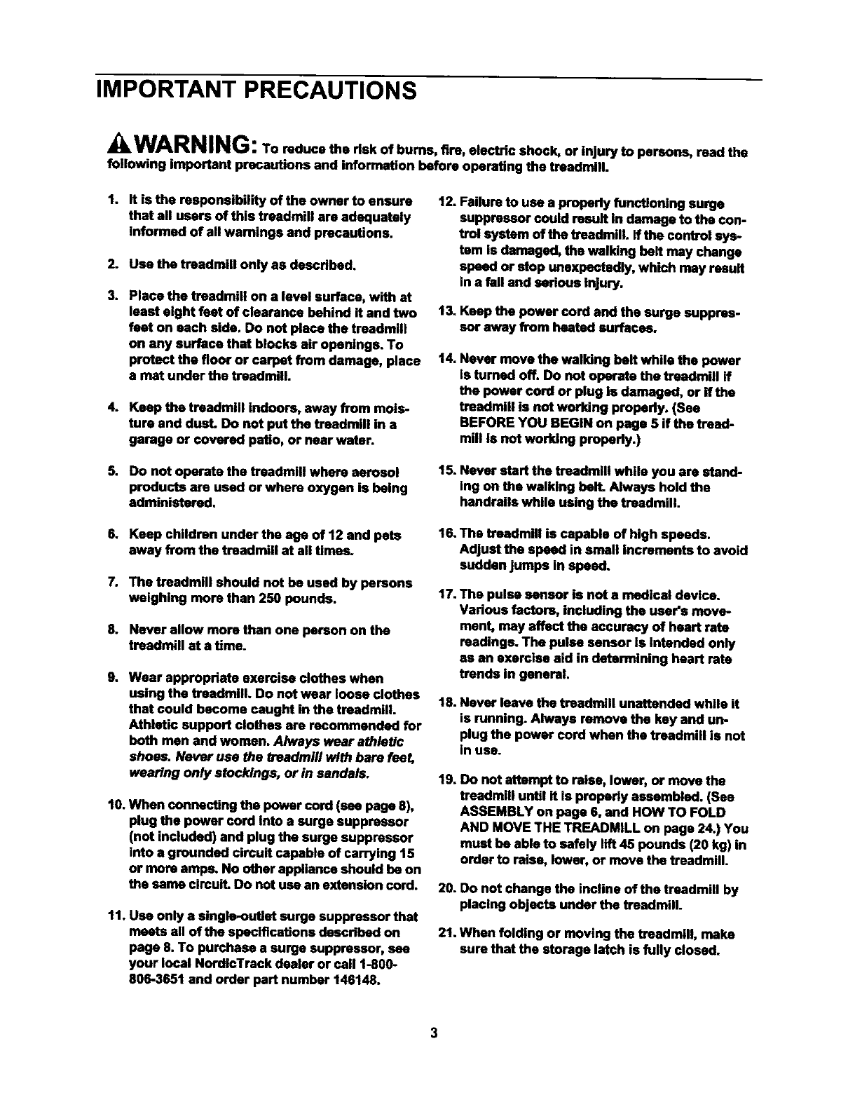 following important precautions and information before operating the treadmill.
