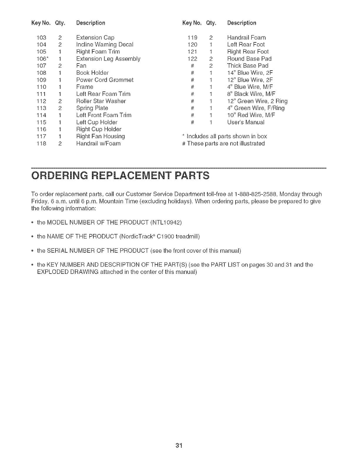 To order replacement parts, call our Customer Service Department toll-free at 1-888-825-2588, Monday through