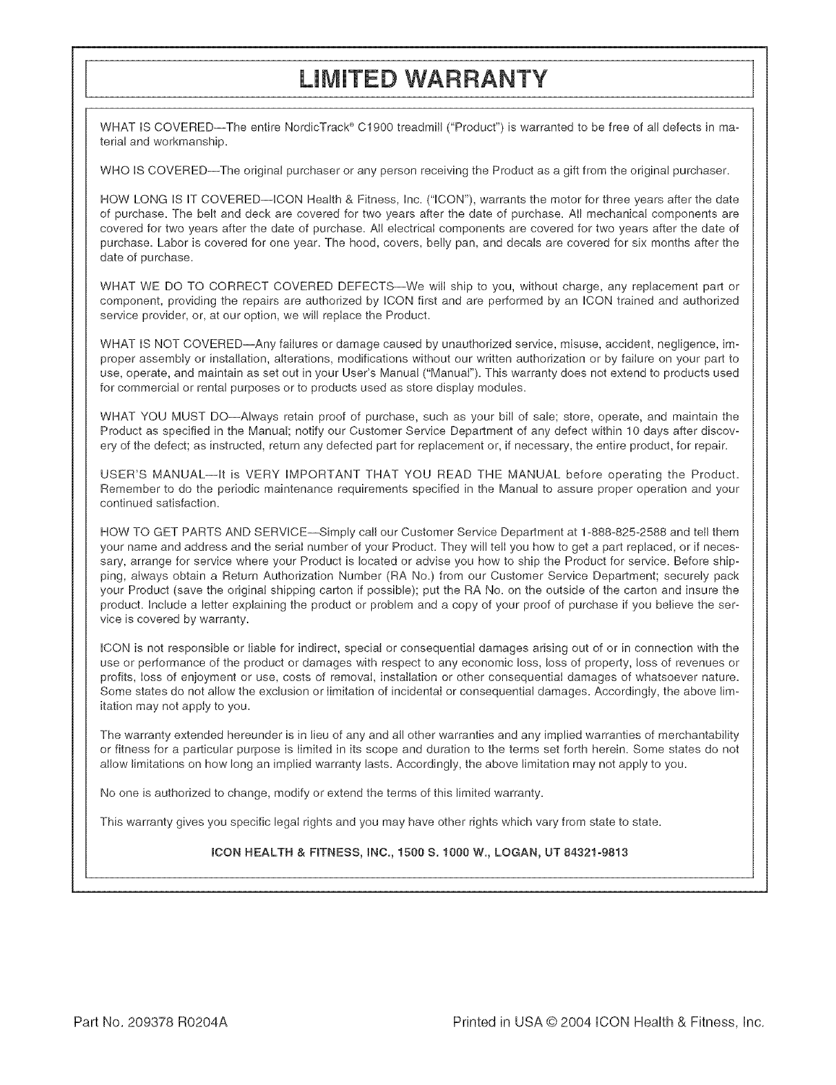 Part No, 209378 R0204A Printed in USA © 2004 ICON Health & Fitness, Inc,