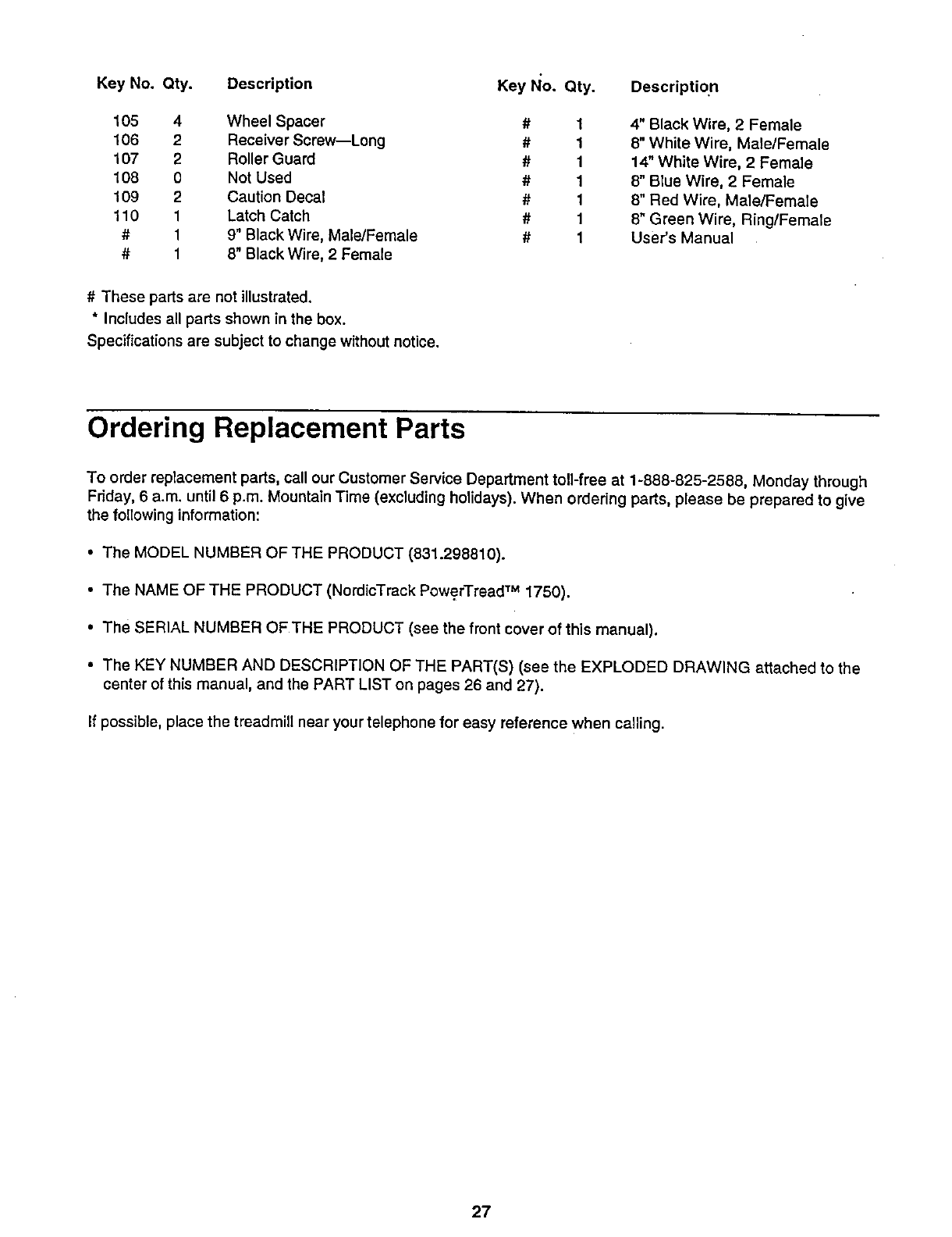 To order replacement parts, call our Customer Service Department toll-free at 1-888-825-2588, Monday through