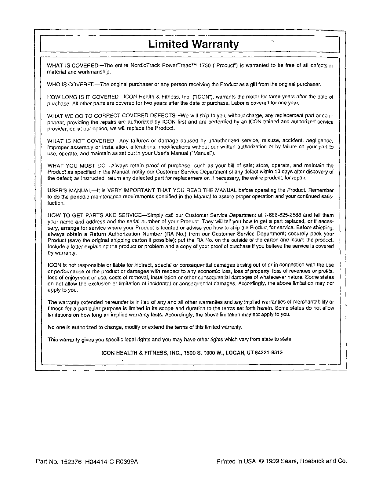 Part No. 152376 H04414+C R0399A Printed in USA © 1999 Sears, Roebuck and Co.