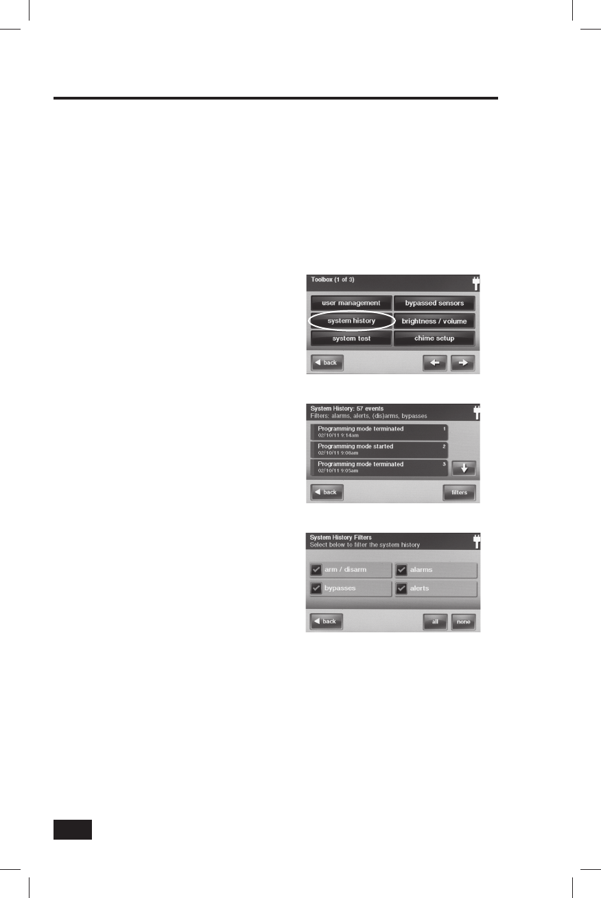 the system and sensor status, system and alarm history, and trouble alerts.
