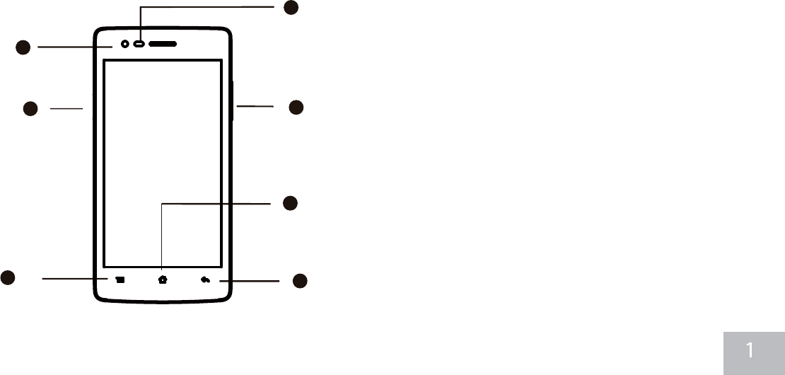 1. Front camera; 2. Light sensor&infrared sensor; 3. Volume button; 4. Power button; 5. Menu key