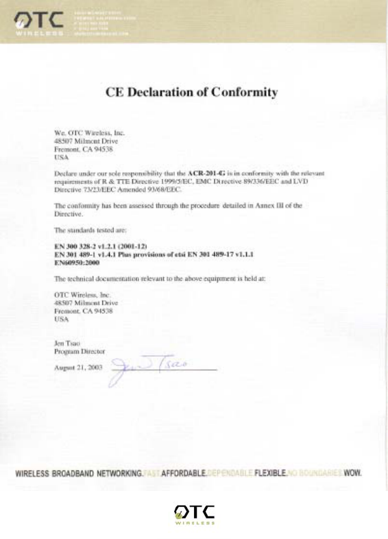Con la presente OTC Wireless, Inc. dichiara che questo ACR-201-G è conforme