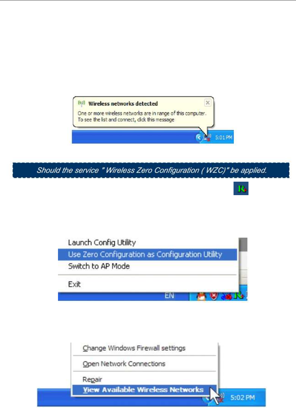 select this item, you can switch between the Windows XP‟s WZC service and the Ralink WLAN utility