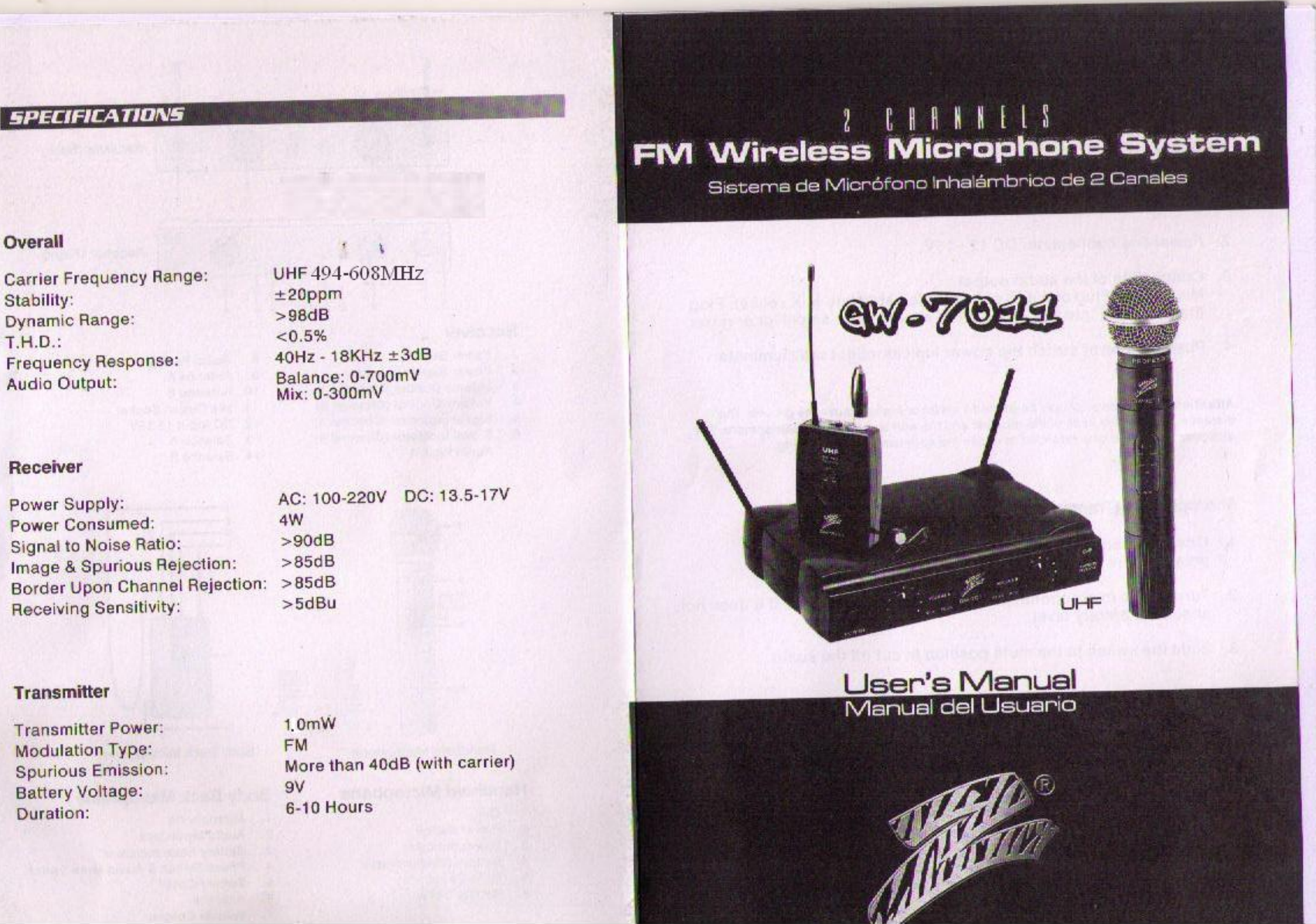 Okura U S A GW-7011 Wireless Microphone User Manual Users manual