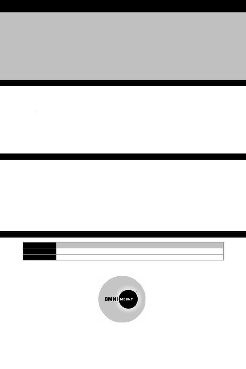 Do not install or assemble if the product or hardware is damaged or missing. If you require replacement parts, contact OmniMount Customer Service at 800.668.6848 or Info@omnimount.com. International