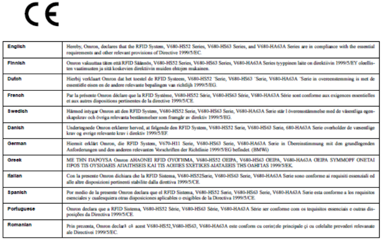 The V680-HAM42-FRT and V680-HS63-SP conform to the following overseas regulations and standards.