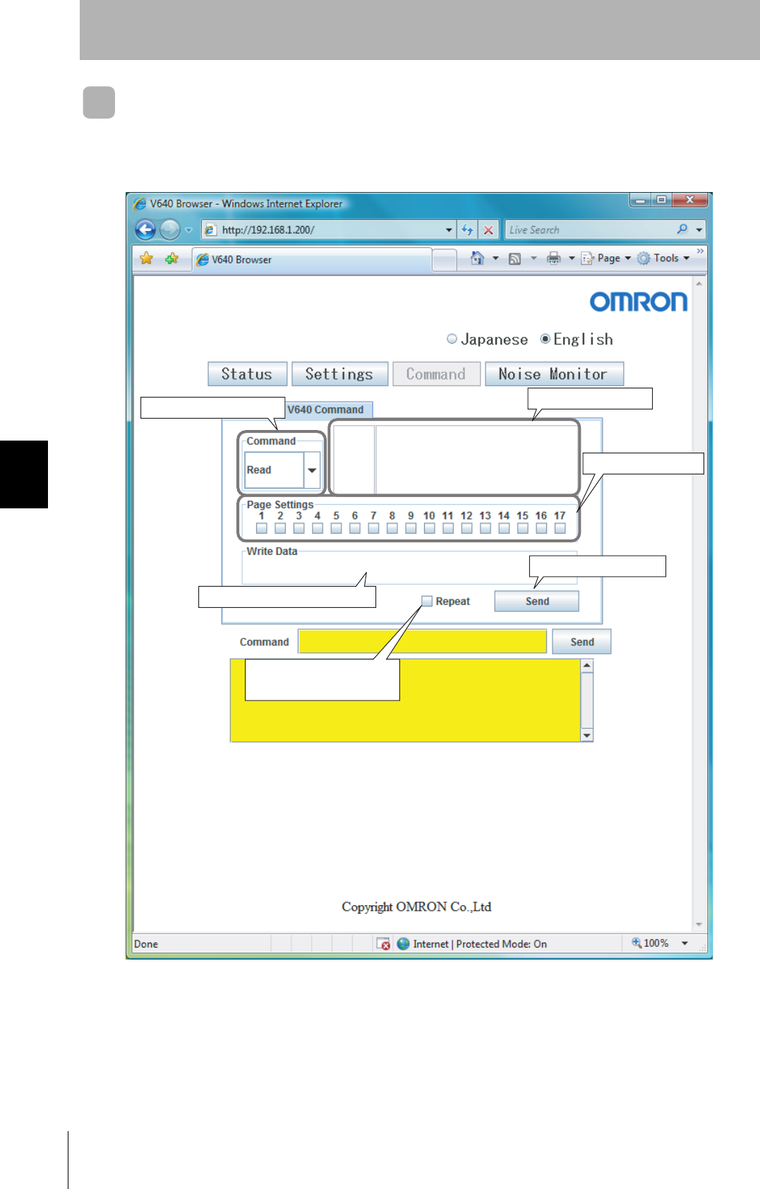 The V640 Command Tab Page allows you to read and write data according to the command format of