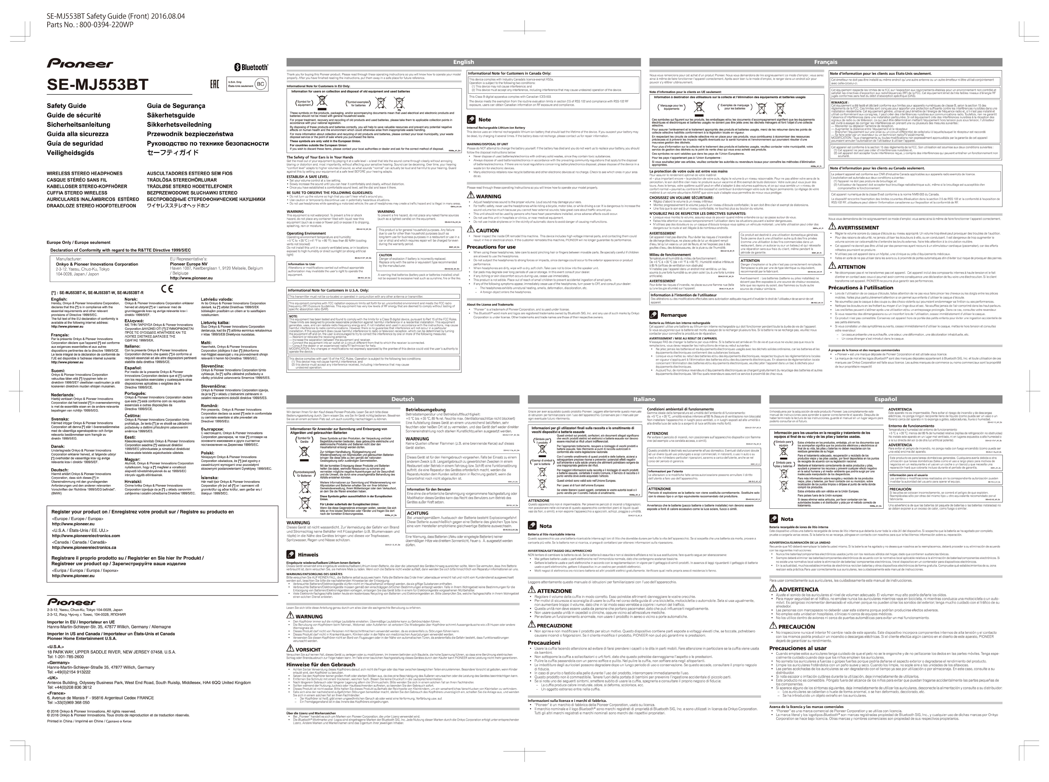 Onkyo and Pioneer Innovations MJ553BT WIRELESS STEREO HEADPHONES User Manual Safety instruction front