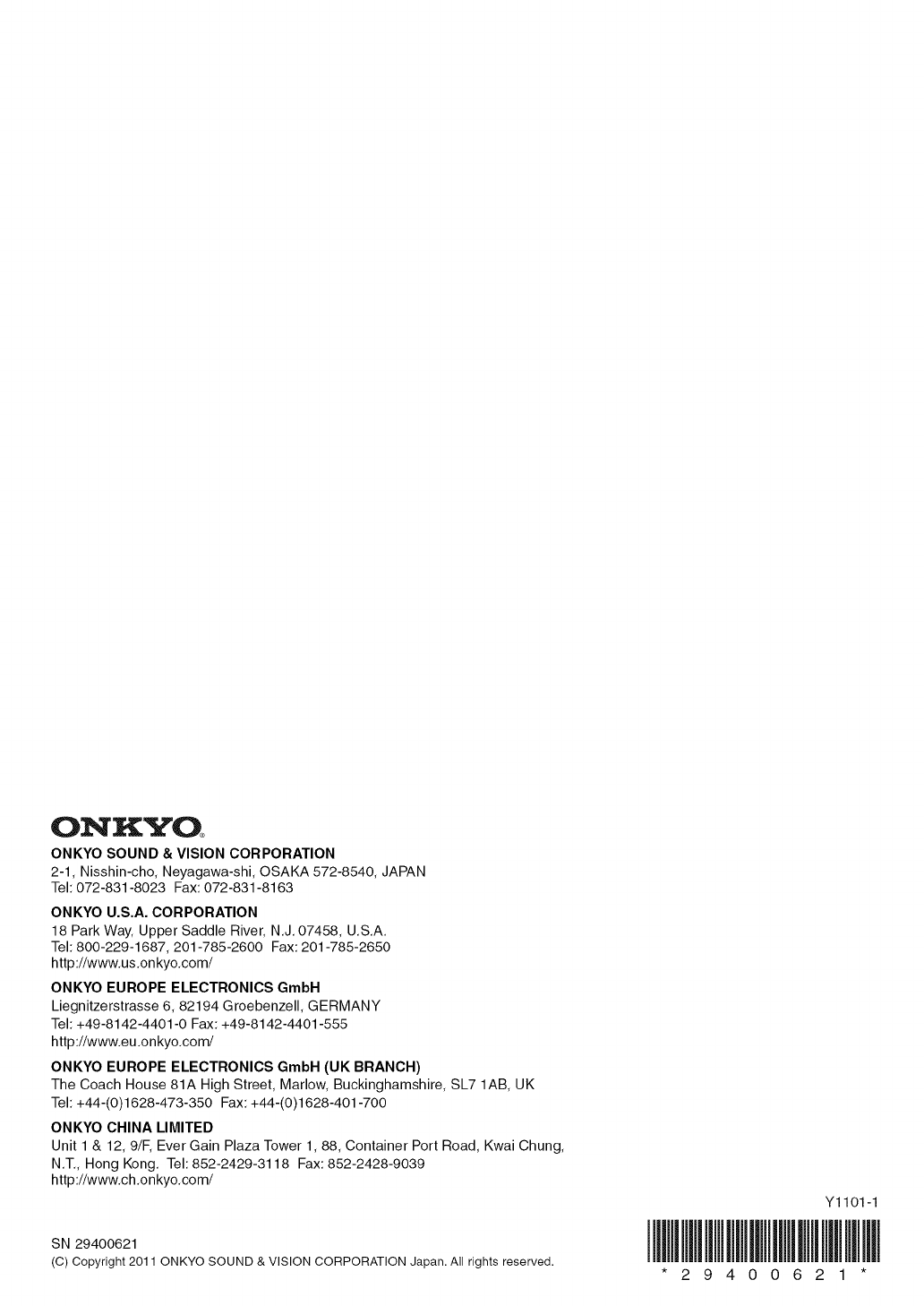 (c) Copyright 2011 ONKYO SOUND & VISION CORPORATIONJapan. All rights reserved. * 2 9 4 0 0 6 2 1 *