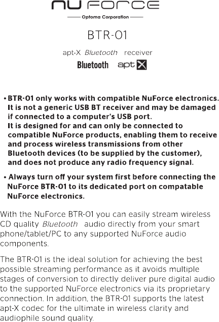 Optoma Corporation apt-X Bluetooth receiver BTR 01 Manual OL for 2