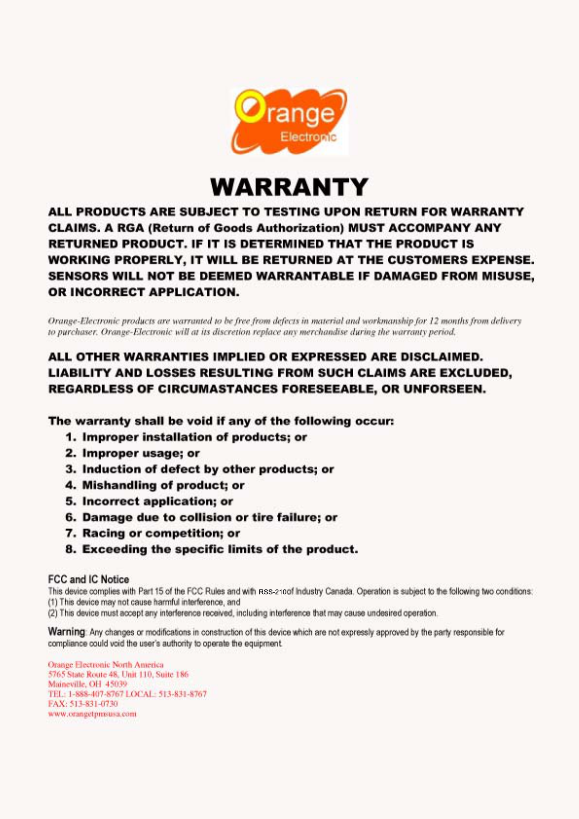 Orange Electronic CO., LTD Tire pressure sensor WARRANTY Orange 2010 9 9 V1 2