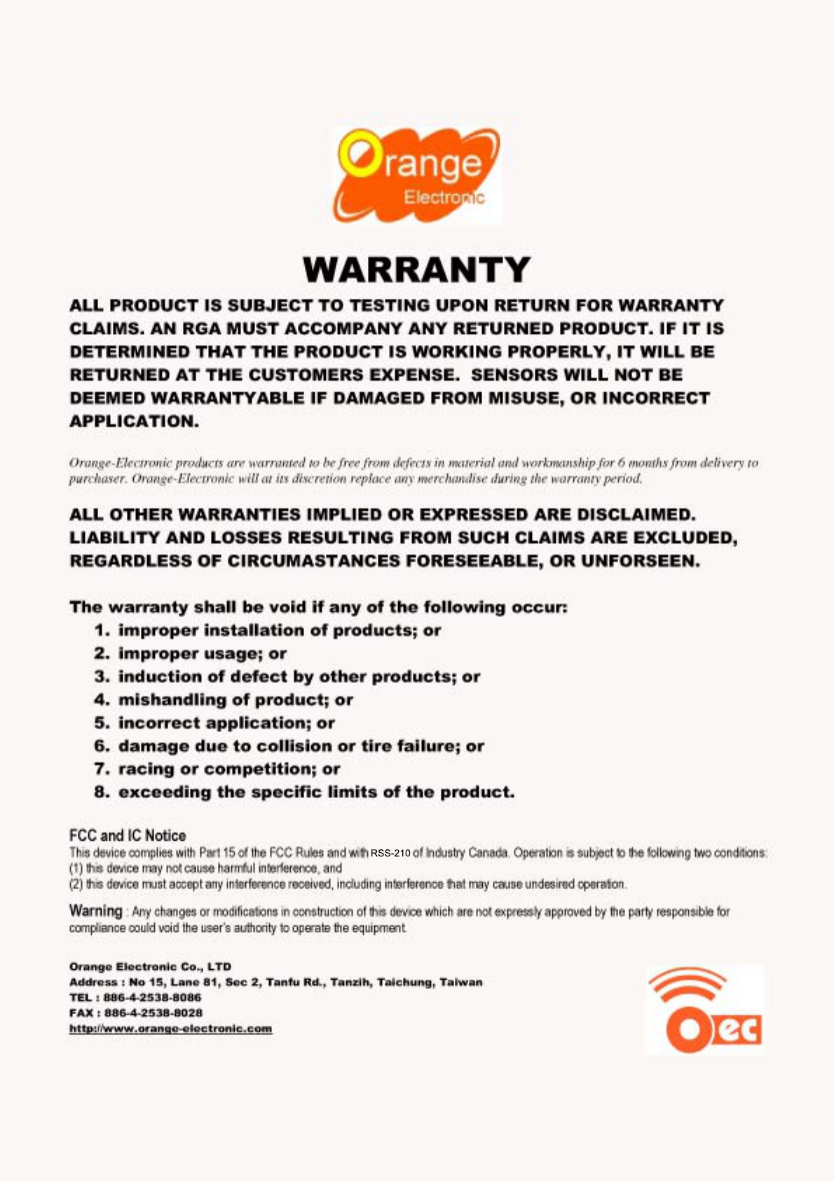 Orange Electronic CO., LTD Tire pressure sensor WARRANTY Orange 2010 9 9 V1 2