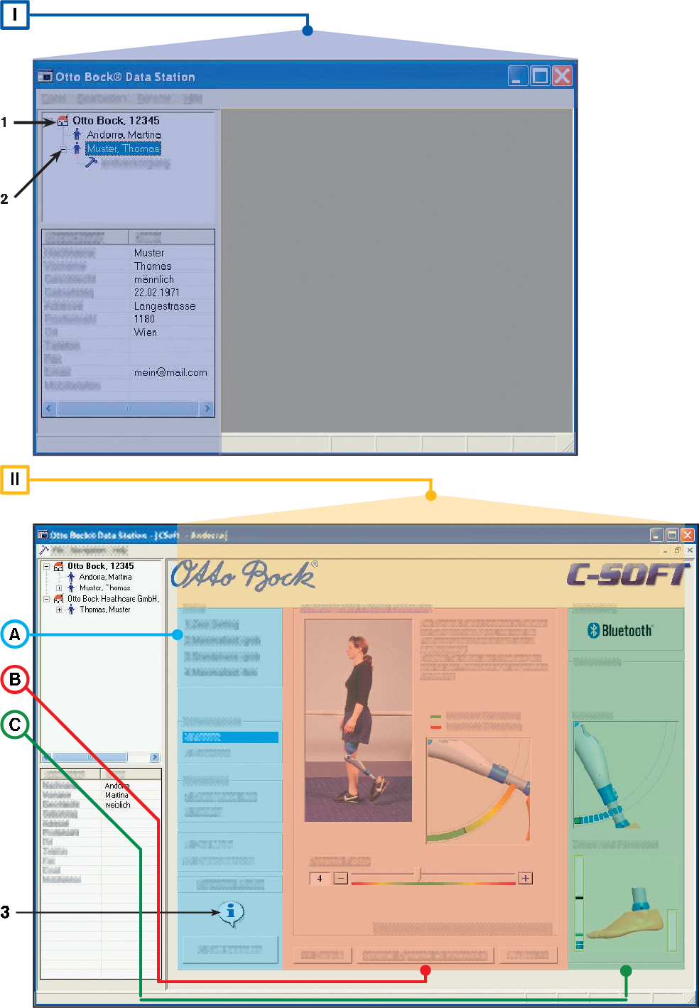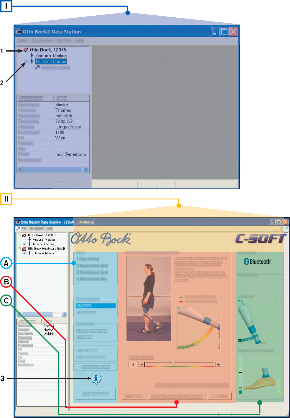 142.7.1 C-Soft in the Otto Bock Data Station (back folded page)Changing the language in the software (optional):In the menu, select Edit - Options with the left mouse key. In the next window, select the tab . Selectthe desired language (by selecting the field in front of the language) and confirm with .IOtto Bock Data Station1  Selecting or creating a patient file:- Select the symbol or text for Company (Marking 1).- See point 3- In the menu File select the sub-category New patient.2  Entering the patients name and personal data:- In the window Patient data enter all personal data of the patient.When selecting the field Address, further patient data appears. All fields marked with an asterisk * mustbe filled out.Confirm the entry by clicking .3  Starting C-Soft:- Select the patient file (patient) with the left mouse button (Marking 2). With  mouse button, click on theselected patient, and in the following window, click on Start C-Soft with the left mouse button.4 Establishing the connection:- By clicking on the corresponding tab, select the type of connection (Bluetooth or RS232/ USB). Thenestablish the connection by selecting Autoconnect (Automatic Establishment of Connection).2.7.2 Otto Bock C-Soft (back folded page)Information:The program does not effect any automatic changes to the settings. The adjustment begins following thesuccessful connection establishment with Step 1. The individual steps are explained with text and images.II Otto Bock C-SoftANavigation section:- All adjustments can be performed in steps (1, 2, etc.). Adjustment steps that are not feasible are highlightedin gray.Note:Read the additional information for every new adjustment!The information can be viewed by clicking on the Information field (Marking 3).- Very experienced users can also use the expert mode by clicking on the Expert mode button.BAdjustment section:- All adjustment steps (1, 2, etc.) are explained with text and images. Follow the instructions to adjust the joint.- You can navigate back and forth between the individual adjustment steps (1, 2, etc.) with the Next andBack buttons.CStatus section:- The status of the connection, battery, as well as knee angle, maximum load, toe load and heel load aredynamically visualized in real time.