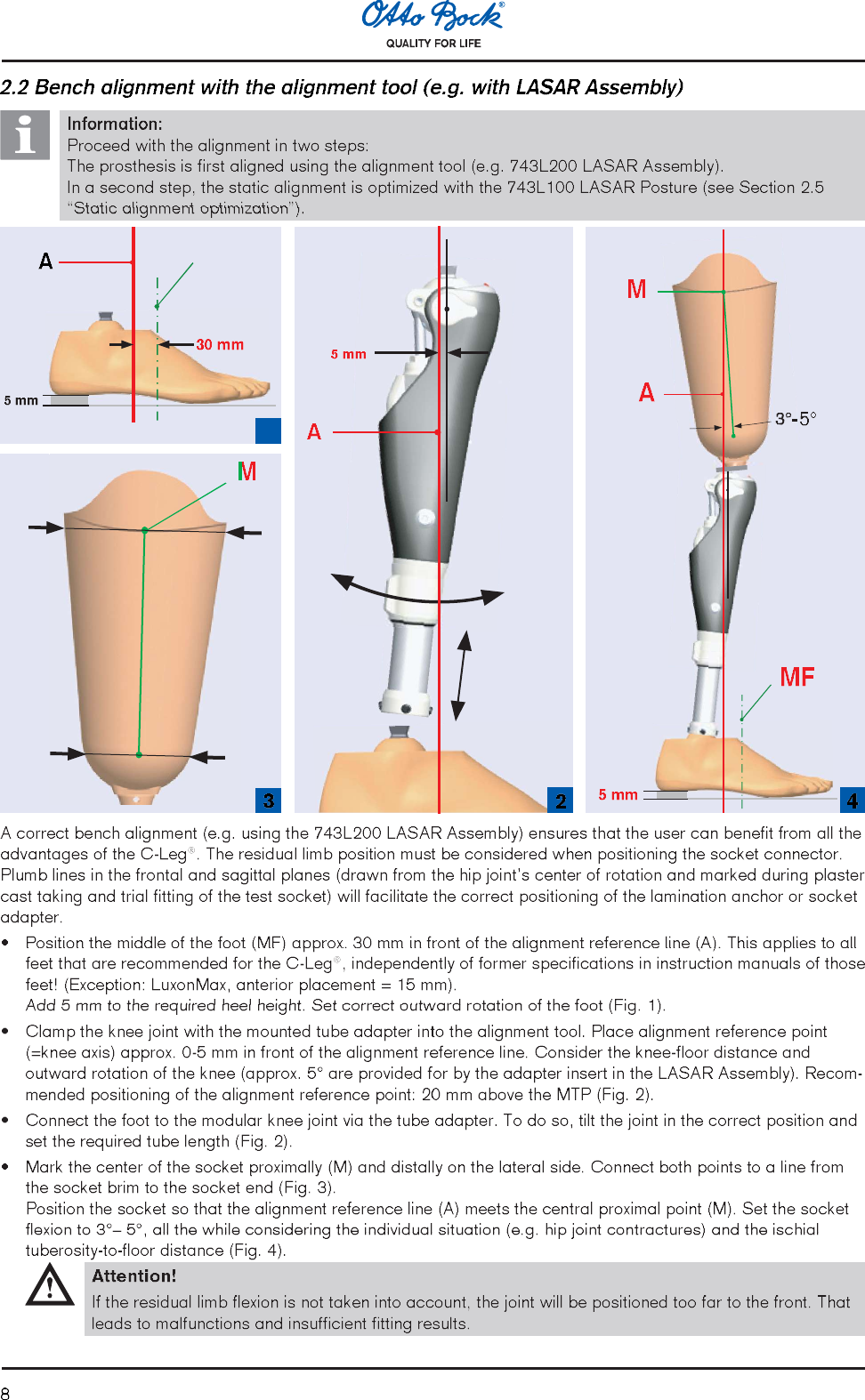 122.5 Static alignment optimization (with LASAR Posture)Load line 30 mm infront of alignmentreference pointLoad lineAlignment referencepointThe static alignment can be considerably optimized with the help of the LASAR Posture. In order to ensure anappropriate stability and at the same time an easy swing phase initiation, proceed as follows:1After the self-calibration of the LASAR device, the load line can be measured. For that, the transfemoral ampu-tee steps onto the force sensing plate with the C-Leg® and onto the height compensation plate with the otherleg. The prosthesis side must be sufficiently loaded (>35% of body weight).2The alignment is adapted exclusively by modifying the plantar flexion so that the load line/laser line runs approxi-mately 30 mm in front of the alignment reference point (=knee axis) of the C-Leg®.3After adjusting the C-Leg® with C-Soft® (see Section 2.7 C-Soft) perform dynamic optimizations during trialwalking.