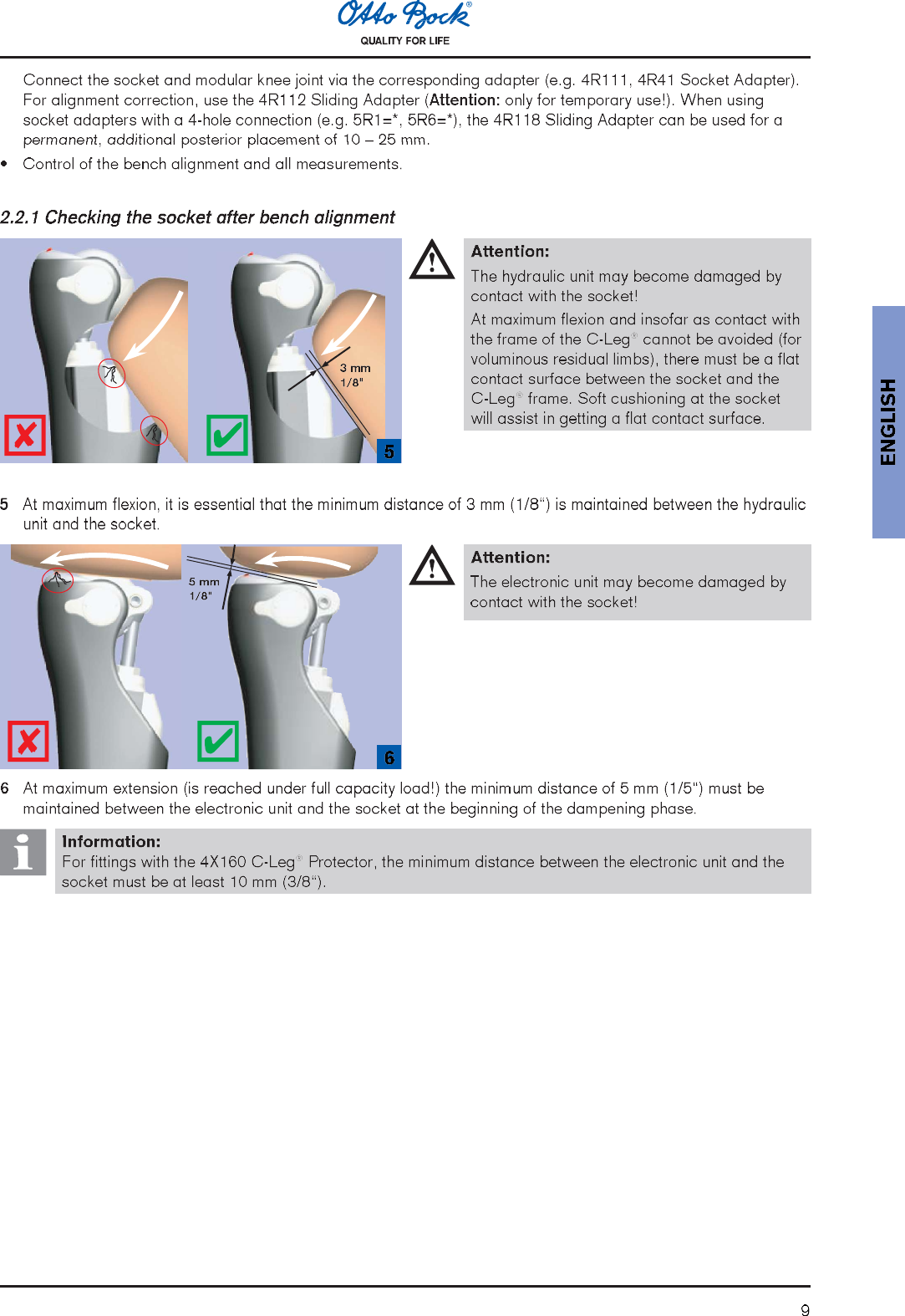 4Explanation of symbols used in these Instructions for UseInformation:Important information about the fitting, use, patient instructions and the product.Attention/Caution:Warning signal for possible technical damages / Warning signal for possible risk of accident or injury.Note:Reference to another instructions for use.Recommended accessories for prosthetists:710D4 Torque Wrench710Y2=5 Hex Bit743L100 LASAR Posture (647H189 Instructions for Use)743L200 / 743L300 LASAR Assembly (647H193 Instructions for Use)60X3 BionicLink (647G192 Instructions for Use)4X180 C-Soft (647G268 Instructions for Use)Information:Before using the C-Leg®, please read these Instructions for Use thoroughly! Please pay special attentionto the safety instructions!The patient must be taught how to handle, care for and operate his/her prosthesis properly. Please seethe following sections: 1.3 Operational conditions, 1.5 Safety instructions, 2.4 Charging the C-Leg®knee joint system, 2.9 Remote control and switching into 2nd mode, 2.11 Important user instructions,3.1 Service intervals, 3.3 Technical information, 3.6 Liability1.1 Medical purposeThe C-Leg® knee joints 3C98-1 and 3C88-1 are to be used exclusively for the exoprosthetic fitting of the lowerextremity.1.2 Field of applicationThe C-Leg® was designed for a broad field of application and can be used by transfemoral amputees as well as byactive hip disarticulation amputees. For knee disarticulation amputees, a version for long residual limbs is available(3C88-1).Field of application according to the Mobility System:Recommended for  (unrestricted outdoor walkers and unrestricted outdoorwalkers with especially rigorous demands).Approved for a .Exception:The 2R80=110 Tube Adapter