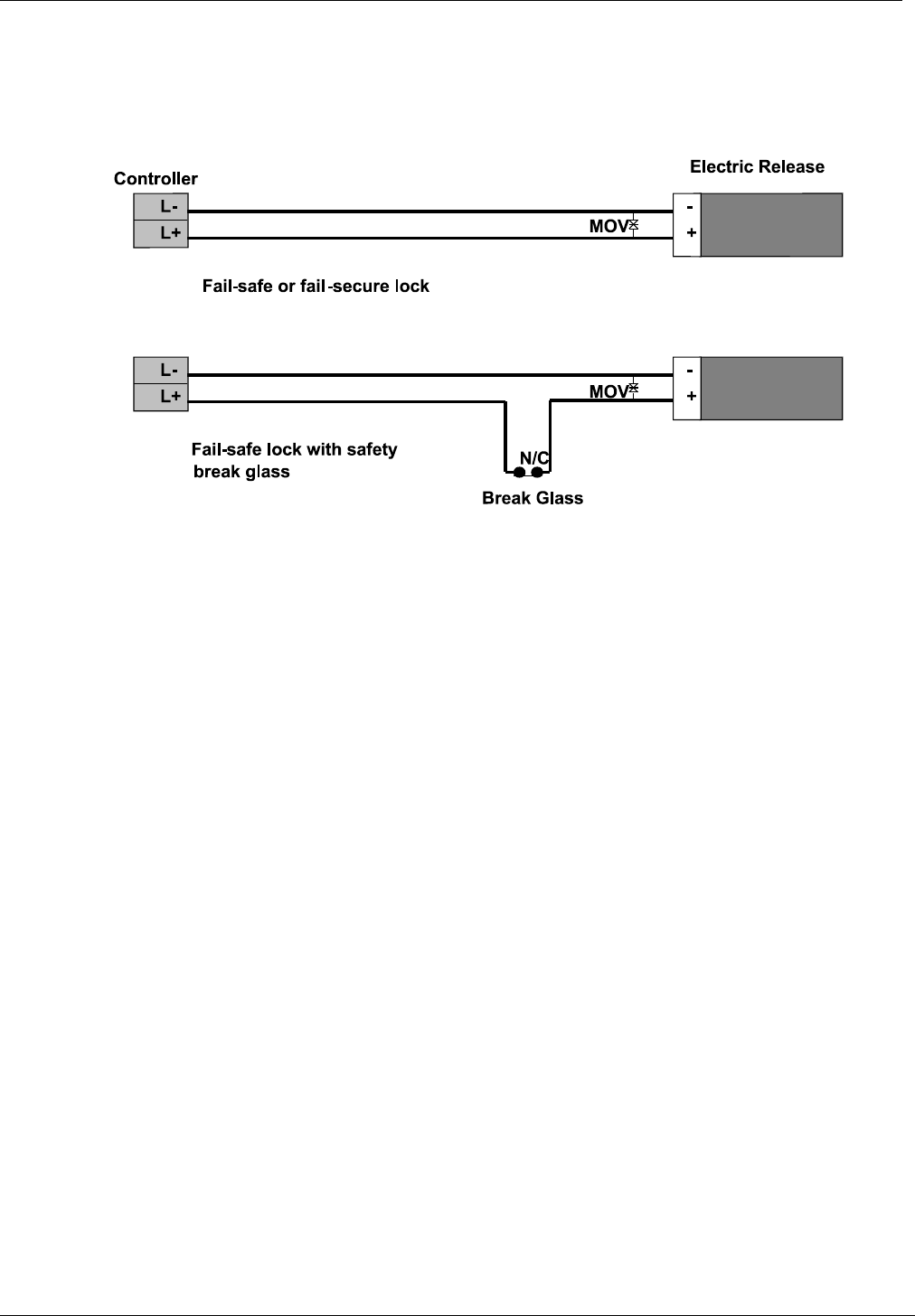 •A normally-closed break-glass or manual pull (B) in the lock supply wiring. So that in