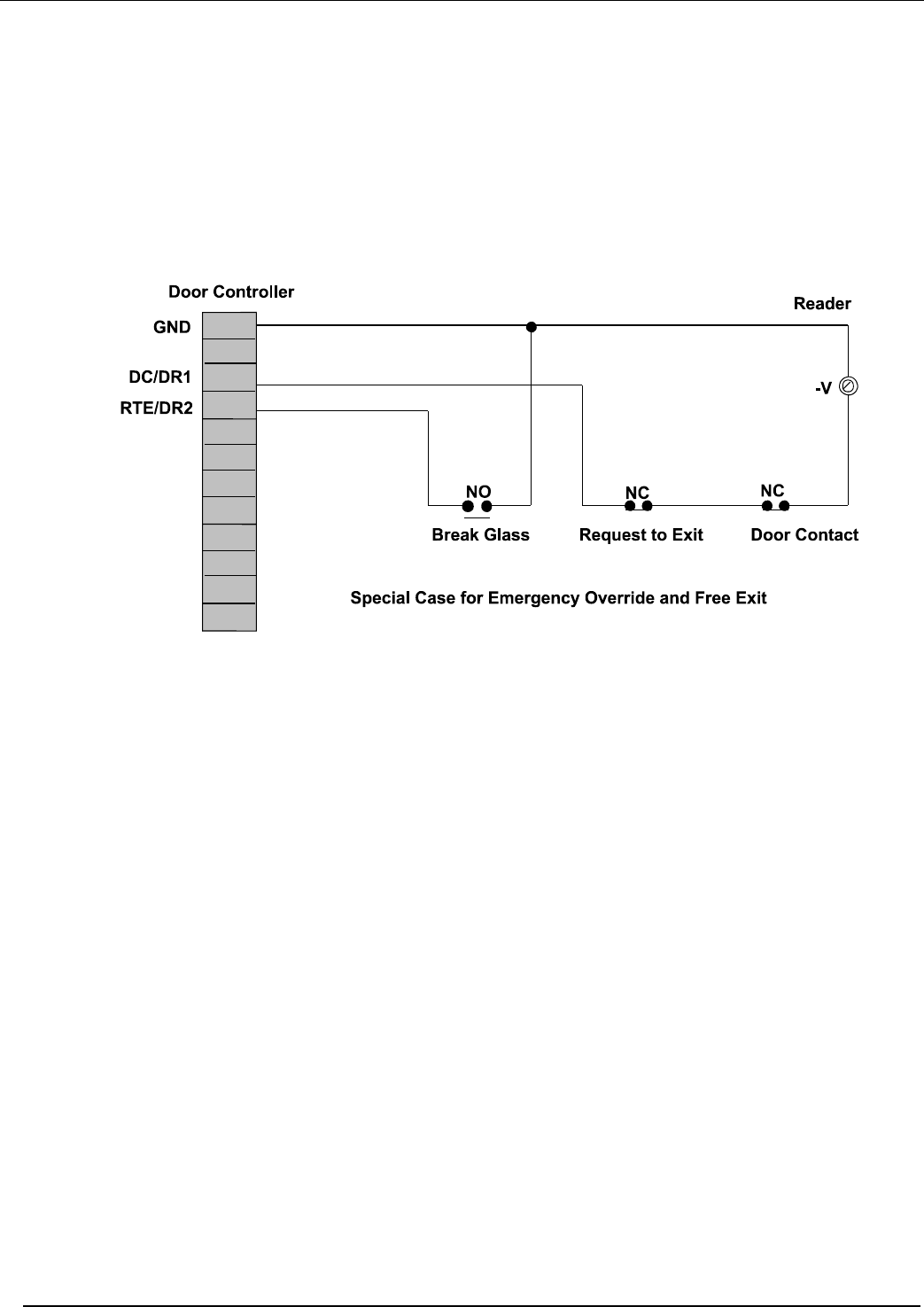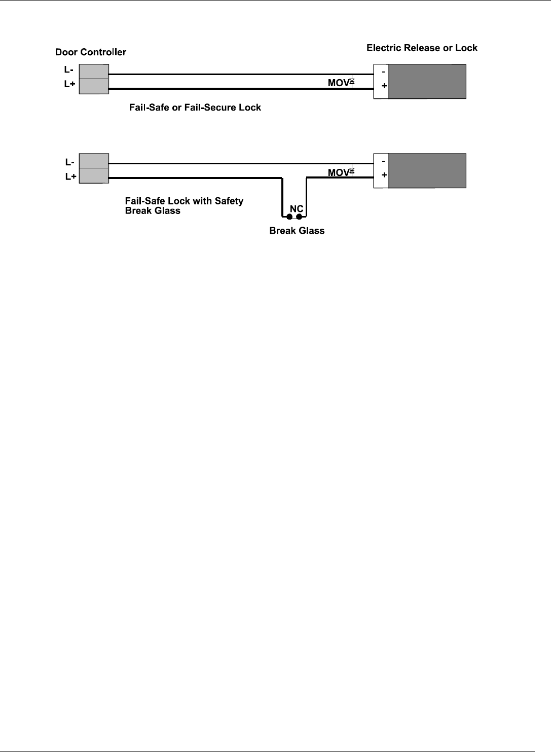 •A normally-closed Break-Glass or Manual Pull (B) in the lock supply wiring. So that in an
