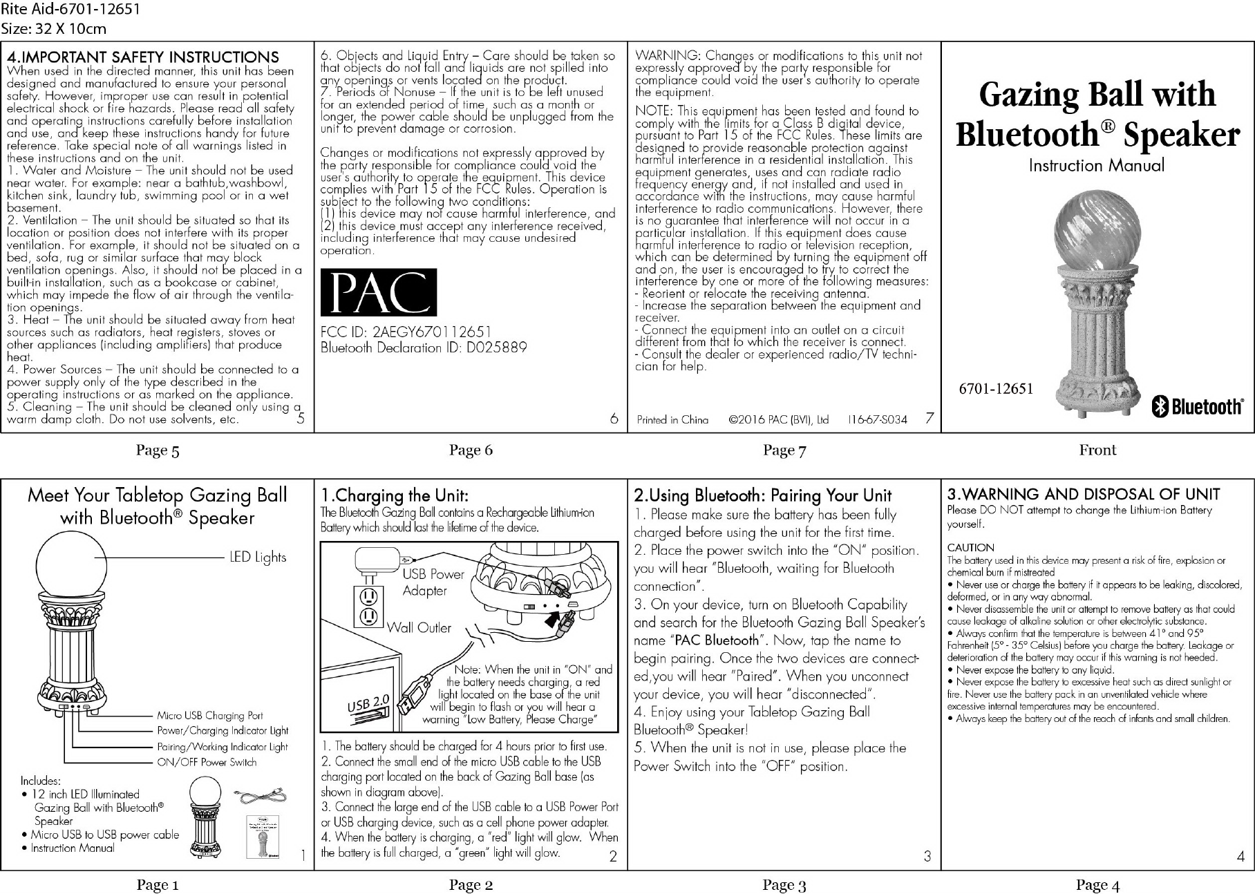 PAN ASIAN CREATIONS 670112651 Bluetooth Product User Manual Print