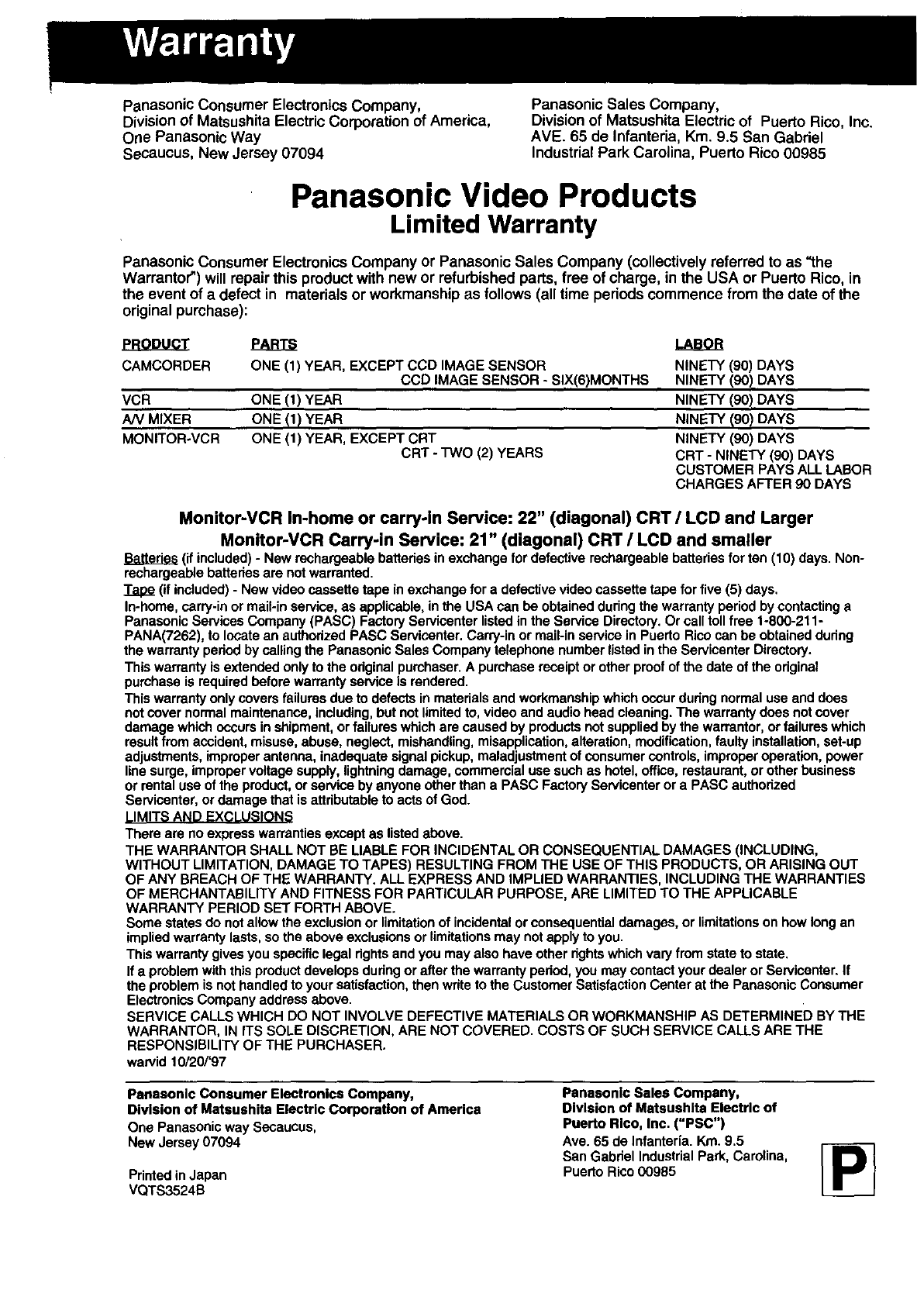 the warranty period by calling the Panasonic Sales Company telephone number listed in the Servicanter Directory.