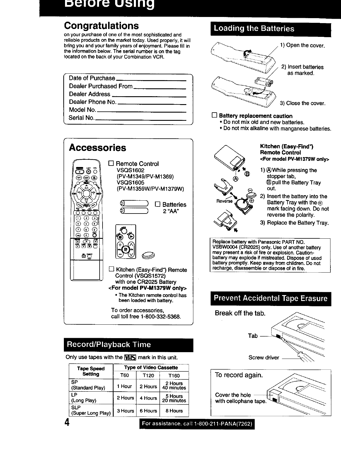 •Record/Playback Time .............. 4•Prevent Accidental Tape Erasure ..4